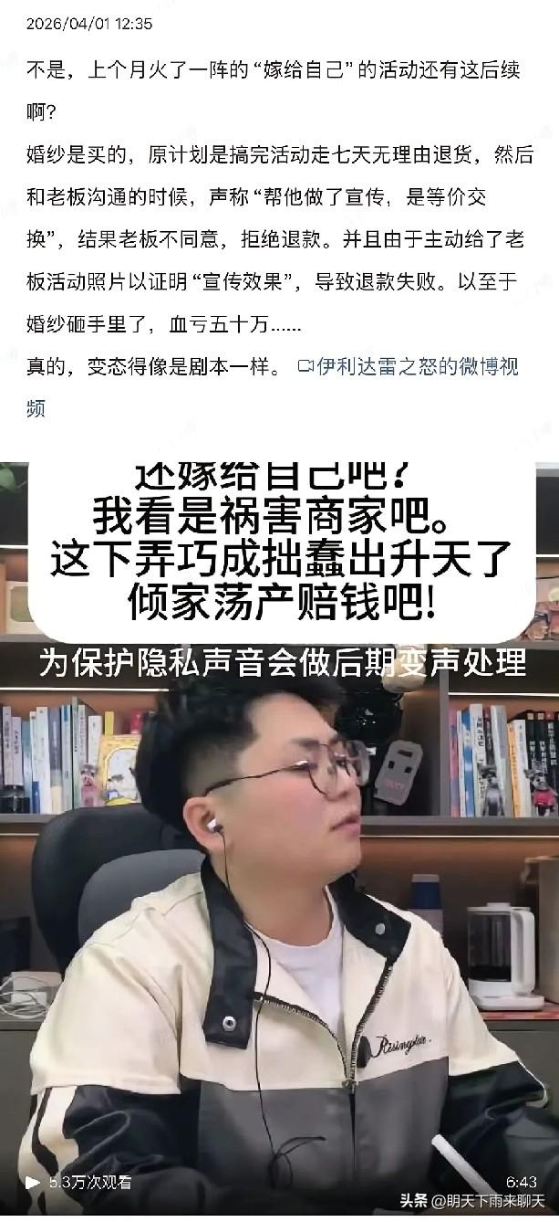 这下麻烦了,组织者及参与者还是好好商量一下这50多万债务该如何化解吧? 不过,换个角度也就想通了,就当是“嫁给自己”所支付的彩礼吧。 70套婚纱价值不菲,你们穿了、热闹了、摆拍了、心理满足了,又要退货了,真当这“七天无理由退货”是万能的? 商家再财大气粗也不可能退款了,这婚纱本就是依据各人身材定制的,又长时间穿着,难免沾上汗渍、灰尘等,还怎么进行二次销售? 这50多万极大概率是要不回来的了,也算是花钱买教训吧。
