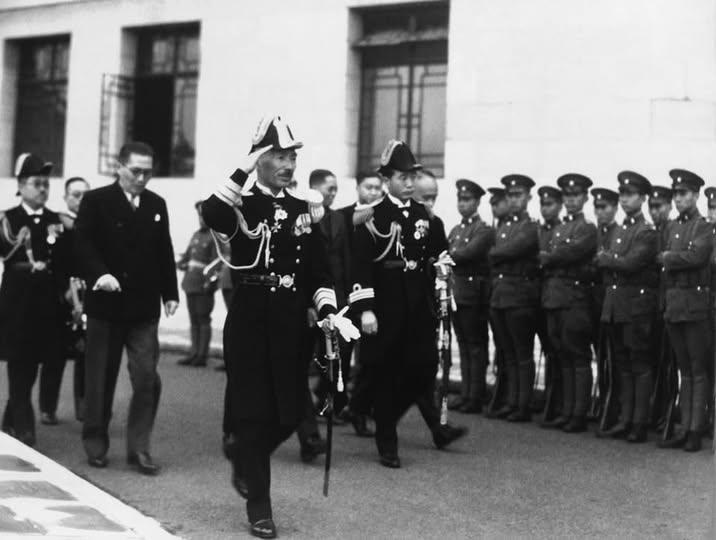 1936年11月16日,大川内传七正式就任日本驻沪海军特别陆战队司令官,随后赴上海市政府拜会时任市长吴铁城,此次拜会是日本军事指挥官到任后的例行外交礼节,表面上是睦邻友好,实则是日本军国主义在上海炫耀武力。 照片中,上海市政府大门前,大川内传七身着日本海军少将制服,向排列整齐的国军保安队礼兵行军礼答礼,此次拜会不到一年后,大川内传七手下的海军中尉大山勇夫强闯上海虹桥机场,被中国守军击毙,成为*淞沪会战的导火索。8月13日,大川内传七指挥日本海军陆战队向上海发起全面进攻,中国军队奋起抵抗,拉开了全面抗战的序幕。