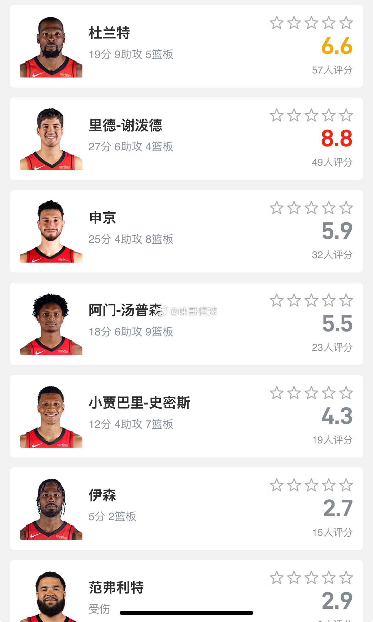 休斯顿火箭里德-谢泼德27分4板6助2断,申京25分8板4助2断1帽,杜兰特19分5板9助1帽;