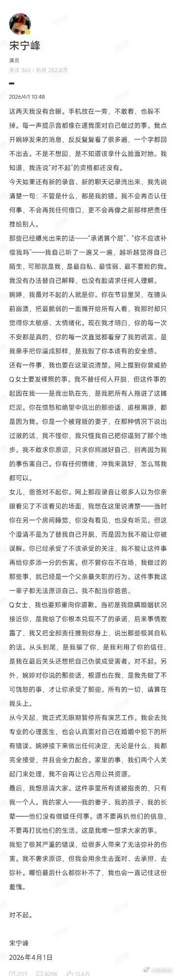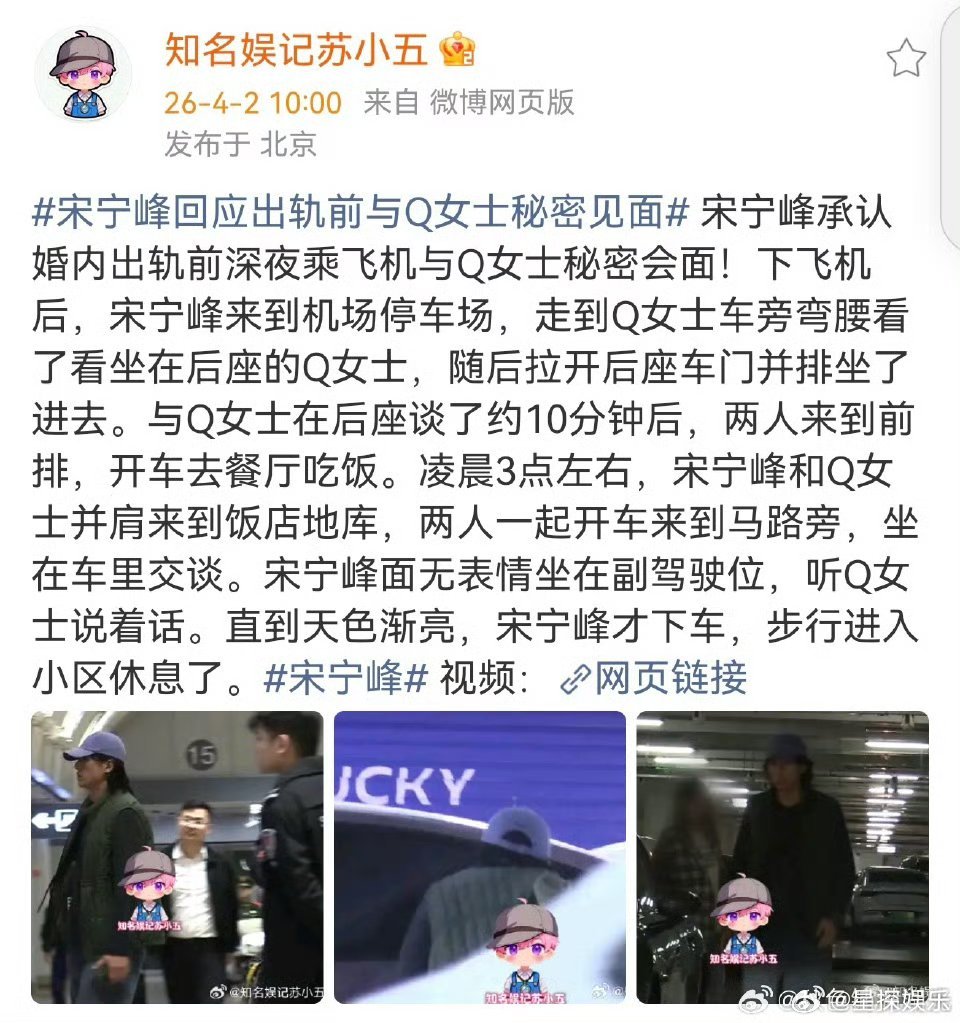 曝宋宁峰Q女士会面最让人无法接受的,从来不是出轨本身,而是把5岁的女儿牵扯进来。现在又被拍在道歉前一周私会Q女士,完全不顾孩子的感受,把孩子当什么了?作为父亲,这是最失职的行为,真的突破了伦理底线。