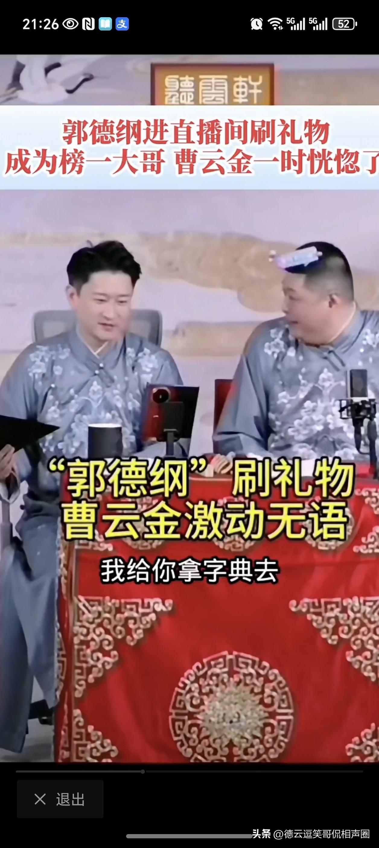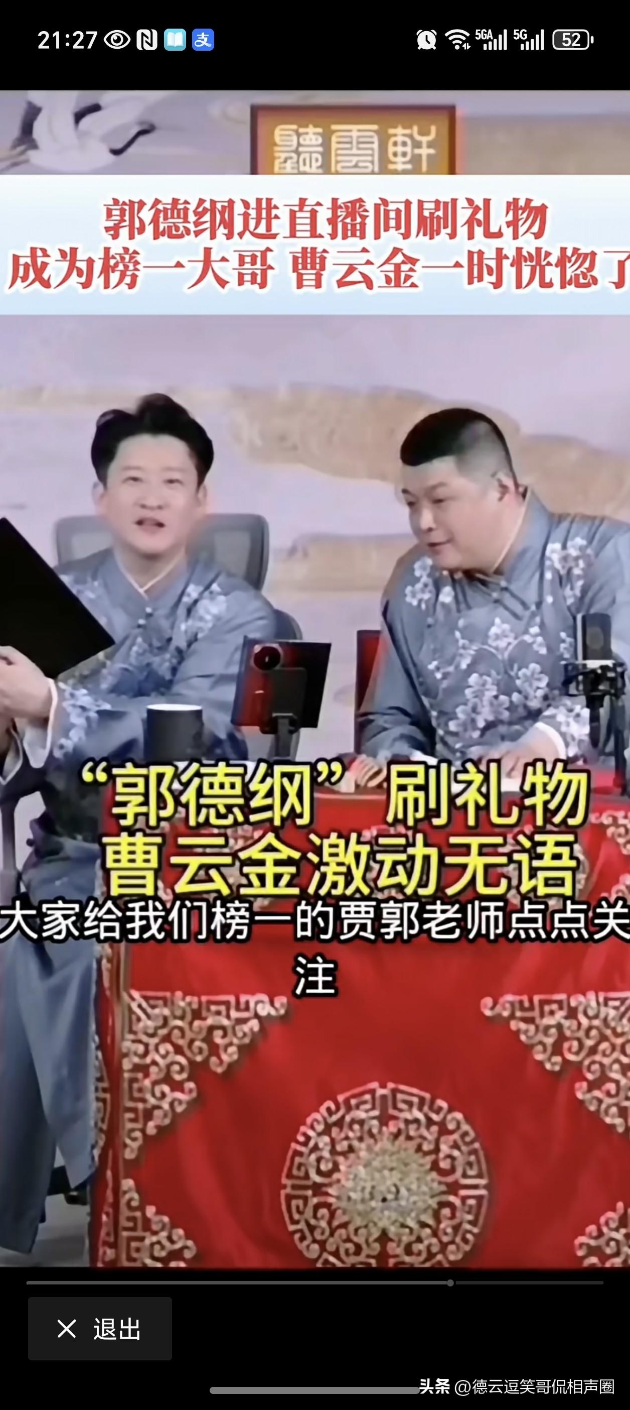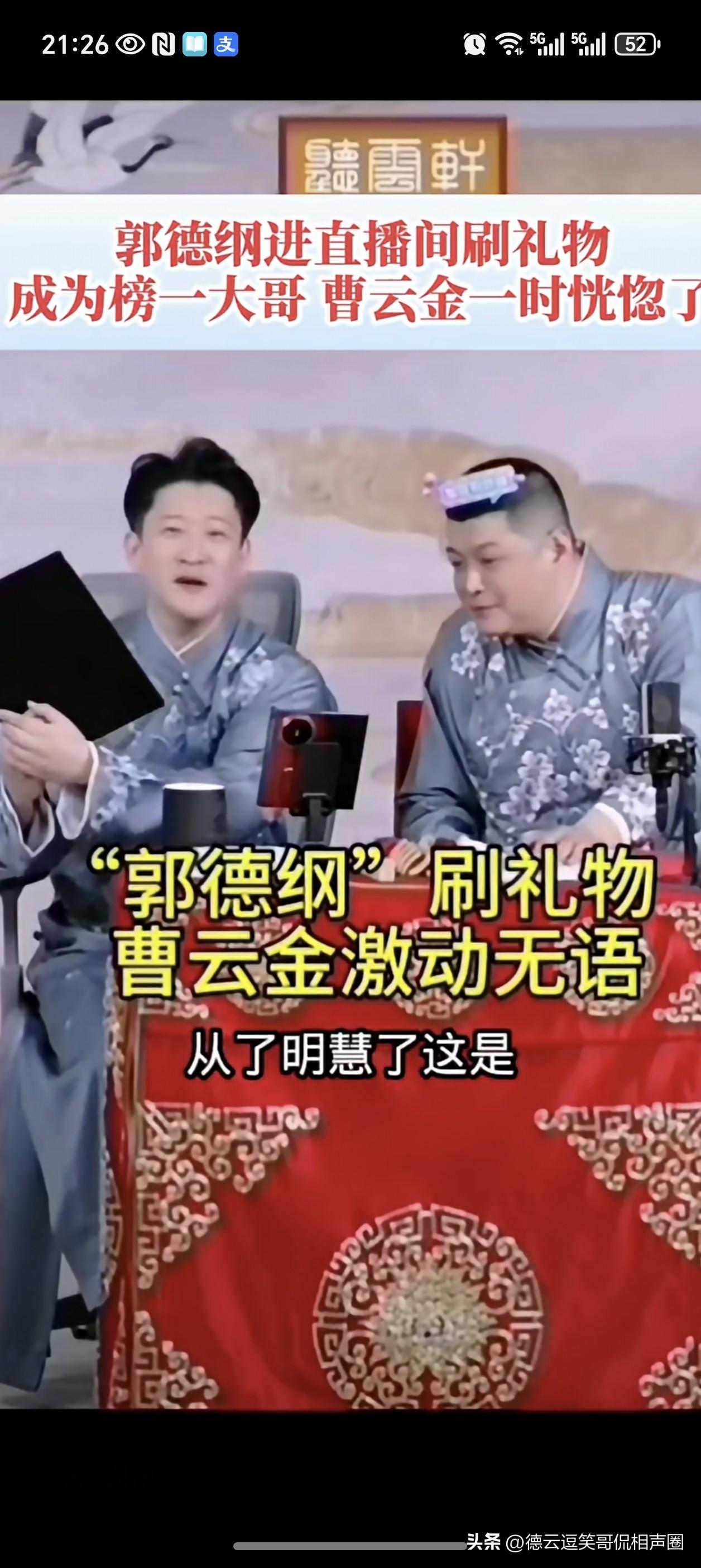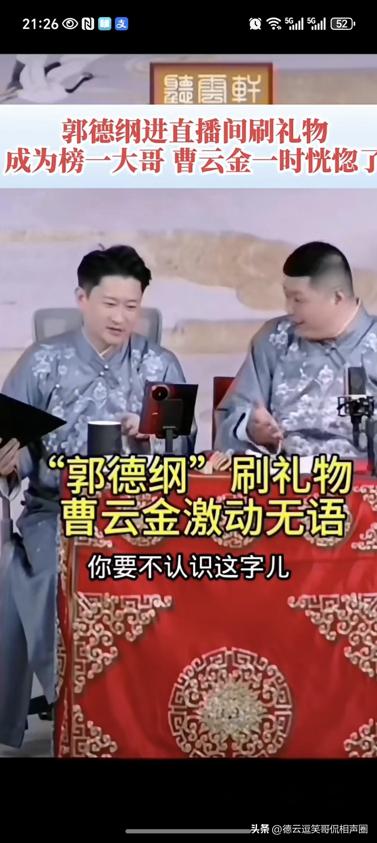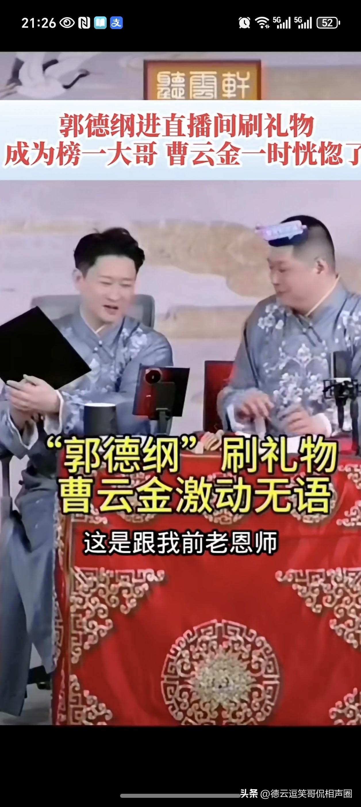 前恩师郭德纲给弃徒曹云金刷礼物,登上直播间榜一,这可把曹云金吓了一大跳。刘云天喊道:“你快瞧瞧是谁给你刷的大火箭、大跑车,都上榜一了,把那三个字念一下,赶紧感谢人家。” 曹云金犹豫许久,不敢相信。刘云天调侃道:“你不认识那三个字吗?我给你拿字典来,看看你认不认识,帮你查一查。” 曹云金笑着说:“感谢前恩师给我送来大跑车、大火箭。大家赶紧关注一下,榜一的假郭老师。”
