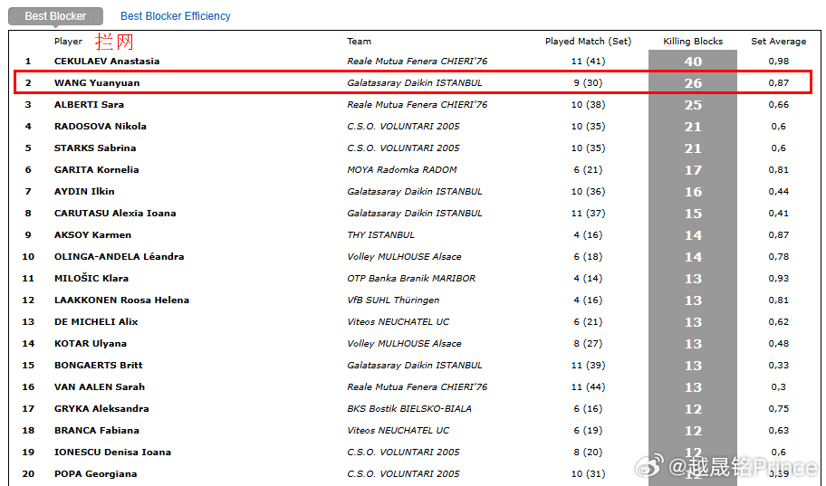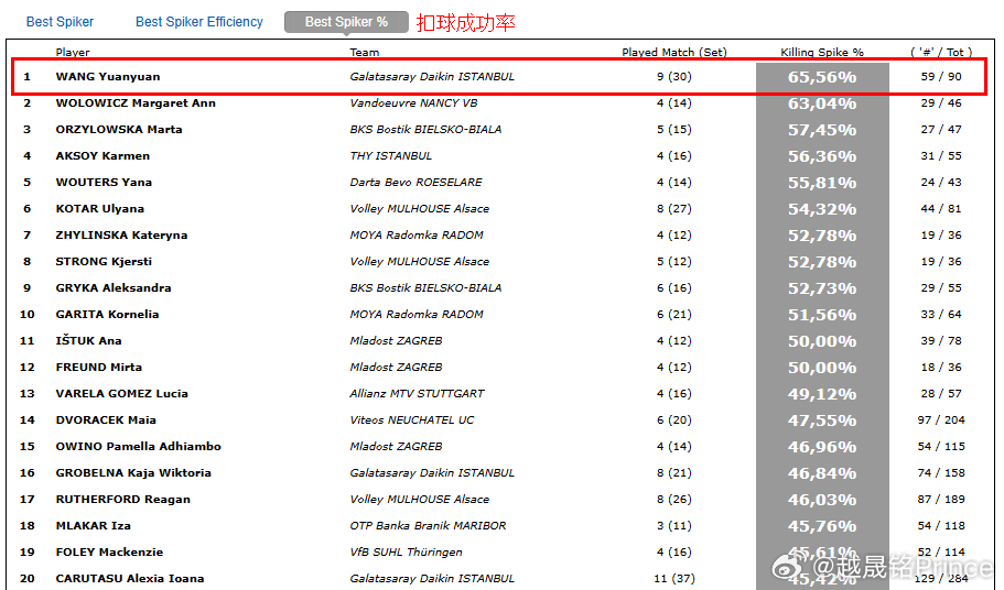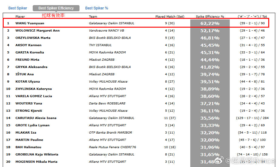 排球 王媛媛留洋第一季 🟡🔴 女排欧联杯决赛首回合比赛结束后,国手王媛媛继续位列进攻成功率+有效率的第1位、拦网第2位。比赛还剩下一场,继续保持!