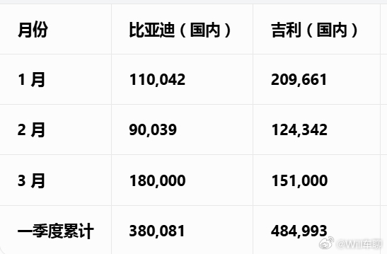 如果从第一季度的国内销量来看,吉利是超过了比亚迪的(图3),超出了10万辆,这个趋势对比亚迪的压力很大了。