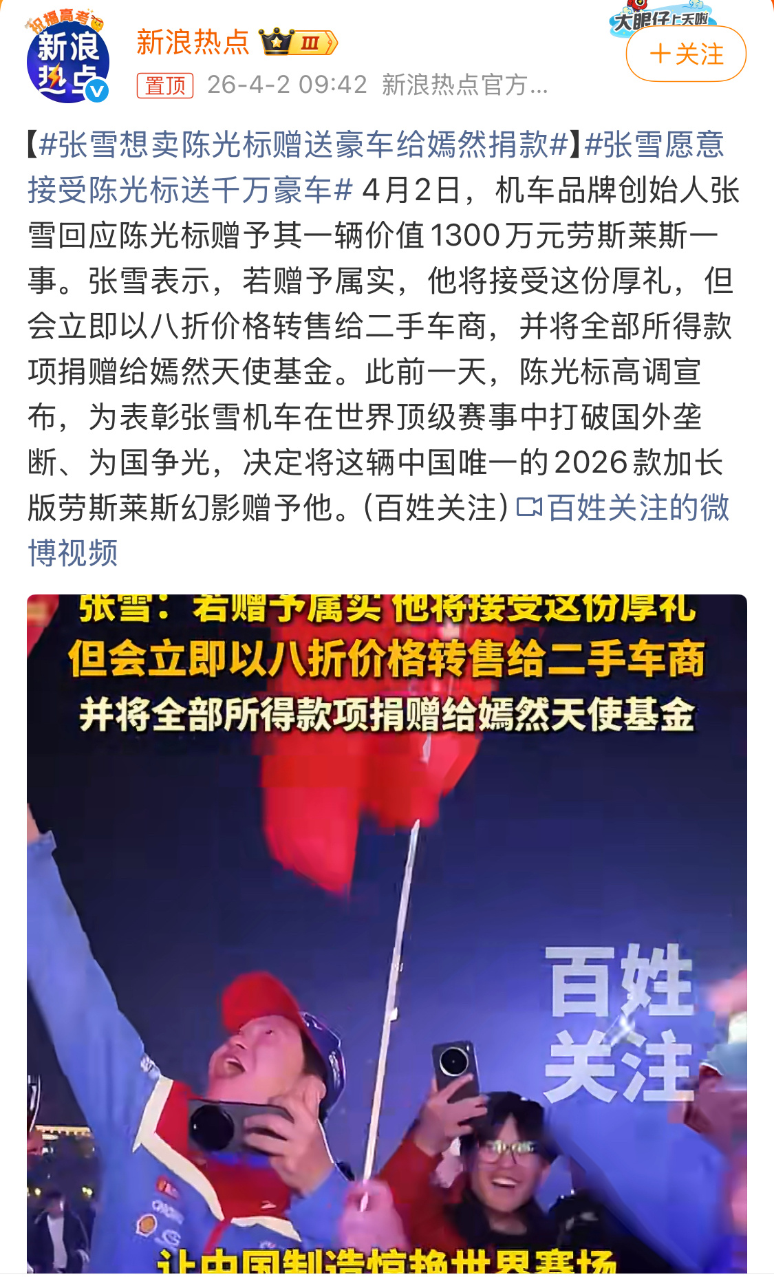 张雪想卖陈光标赠送豪车给嫣然捐款这下陈光标不得不送了,张雪高情商出二手,钱都捐掉,传递爱心。但这么一来,收了人家礼物,是不是等于欠一份人情?