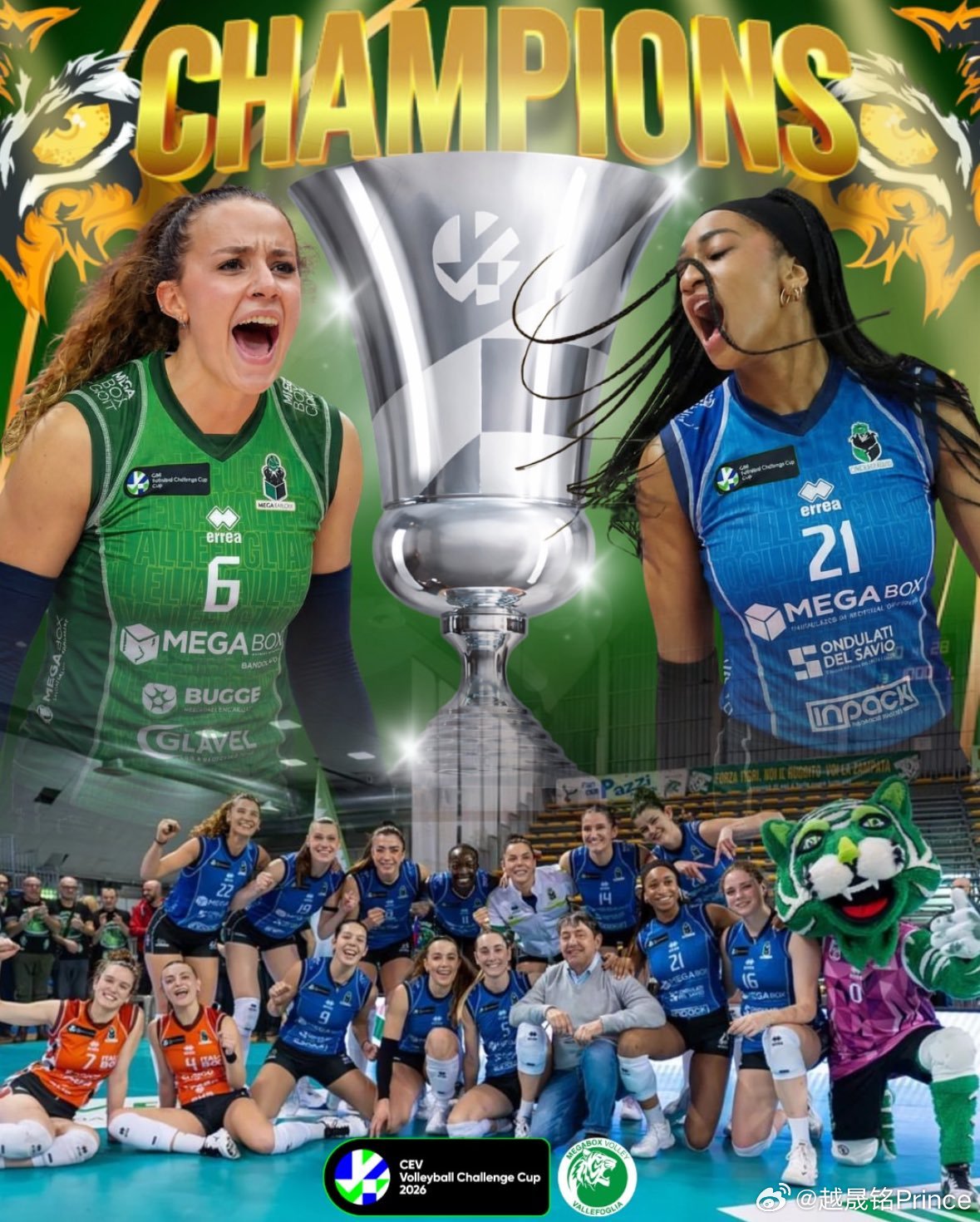 排球 🏆25-26赛季男排欧挑杯结束,意大利米兰俱乐部主、客场3-0双杀来自比利时的林德曼斯,无悬念夺冠。下赛季将转会至佩鲁贾队的比利时明星球员费雷.雷格斯,获评最有价值球员。至此,本赛季男/女排欧挑杯冠军奖杯均由意大利球队捧得👇。
