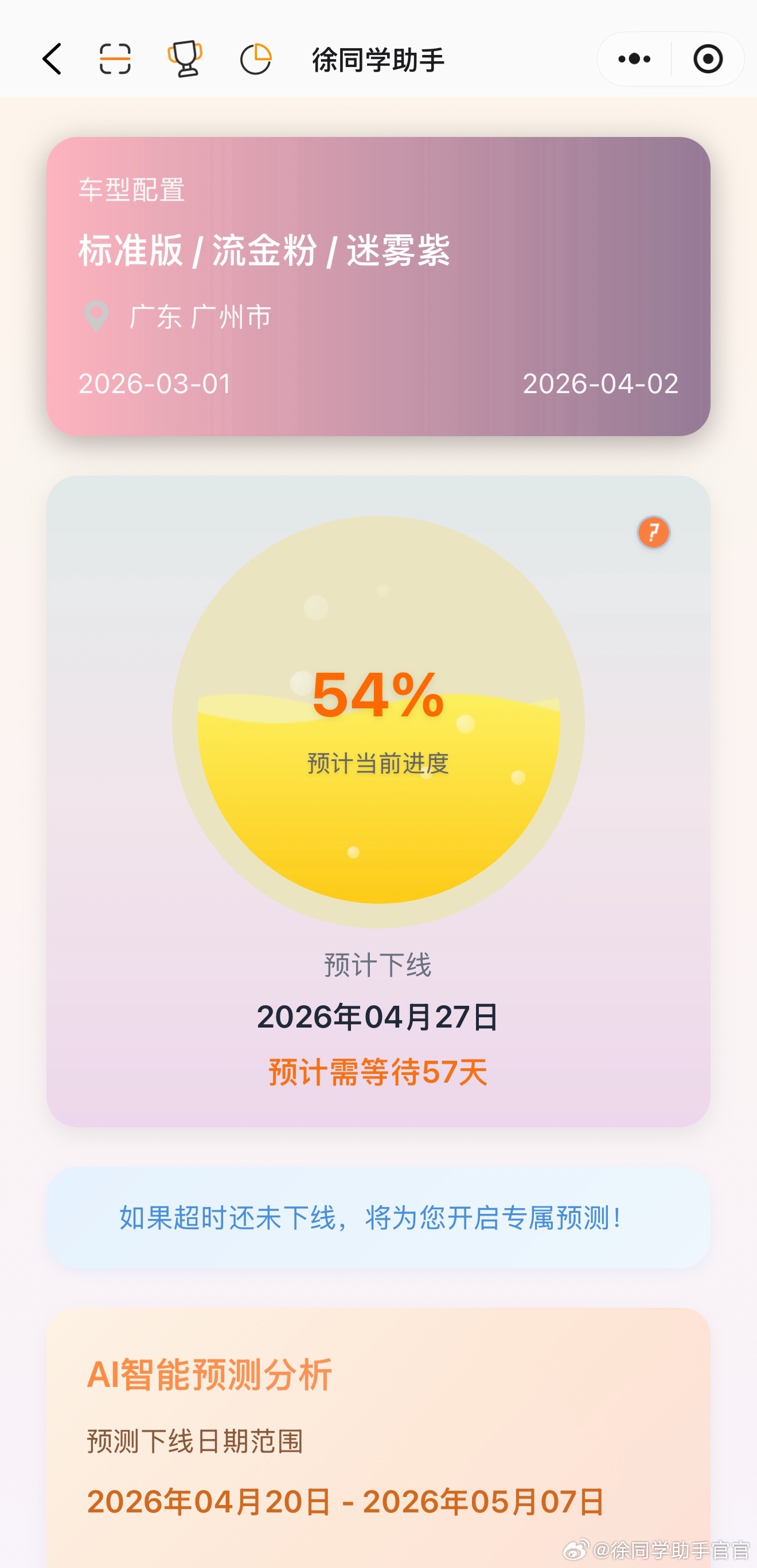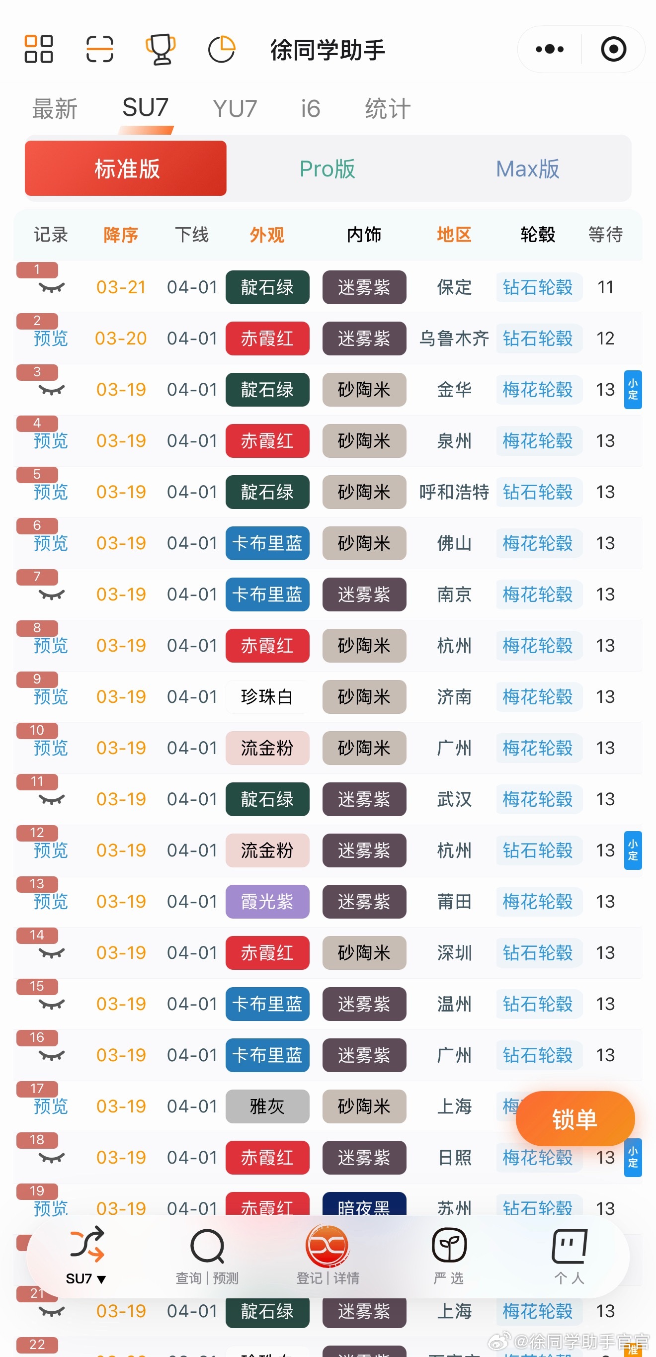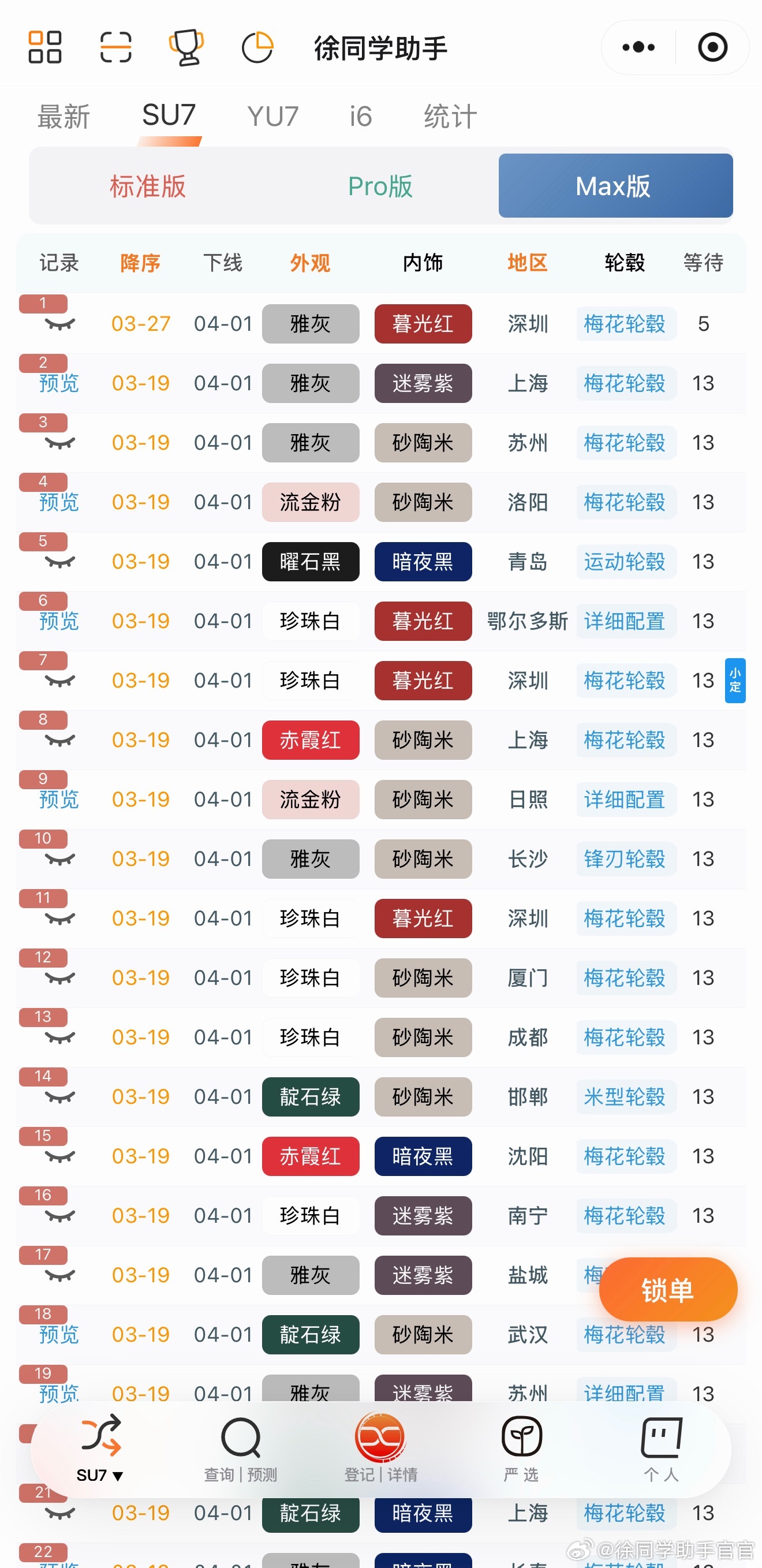📈下线进度1️⃣小订下线以剩余周数2-5周的为主,标准版的卡布里蓝集中生产了一批,pro版雅灰挺多的,max版以新色为主。2️⃣老带新这几天集中生产下线,很多等了半年的准车主终于开始收到通知了,也包括3.20锁单的。3️⃣大定优先级排在最后,比小订用户晚交付两周左右。