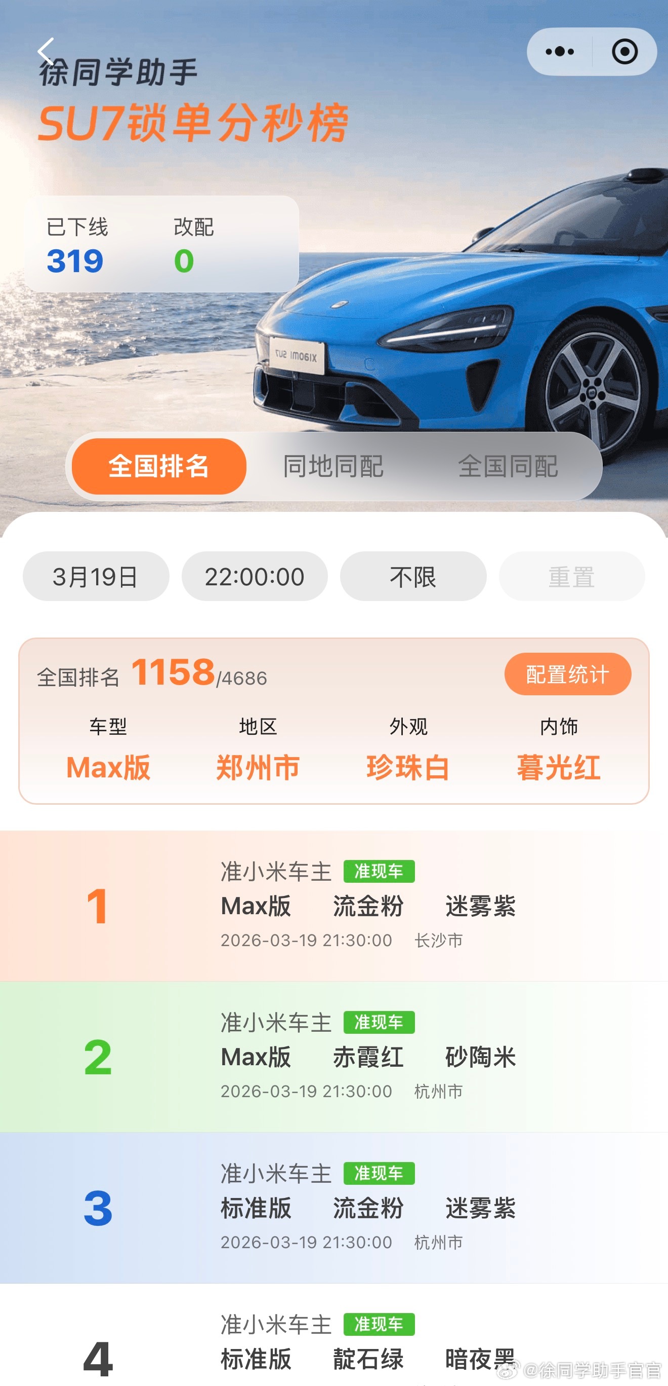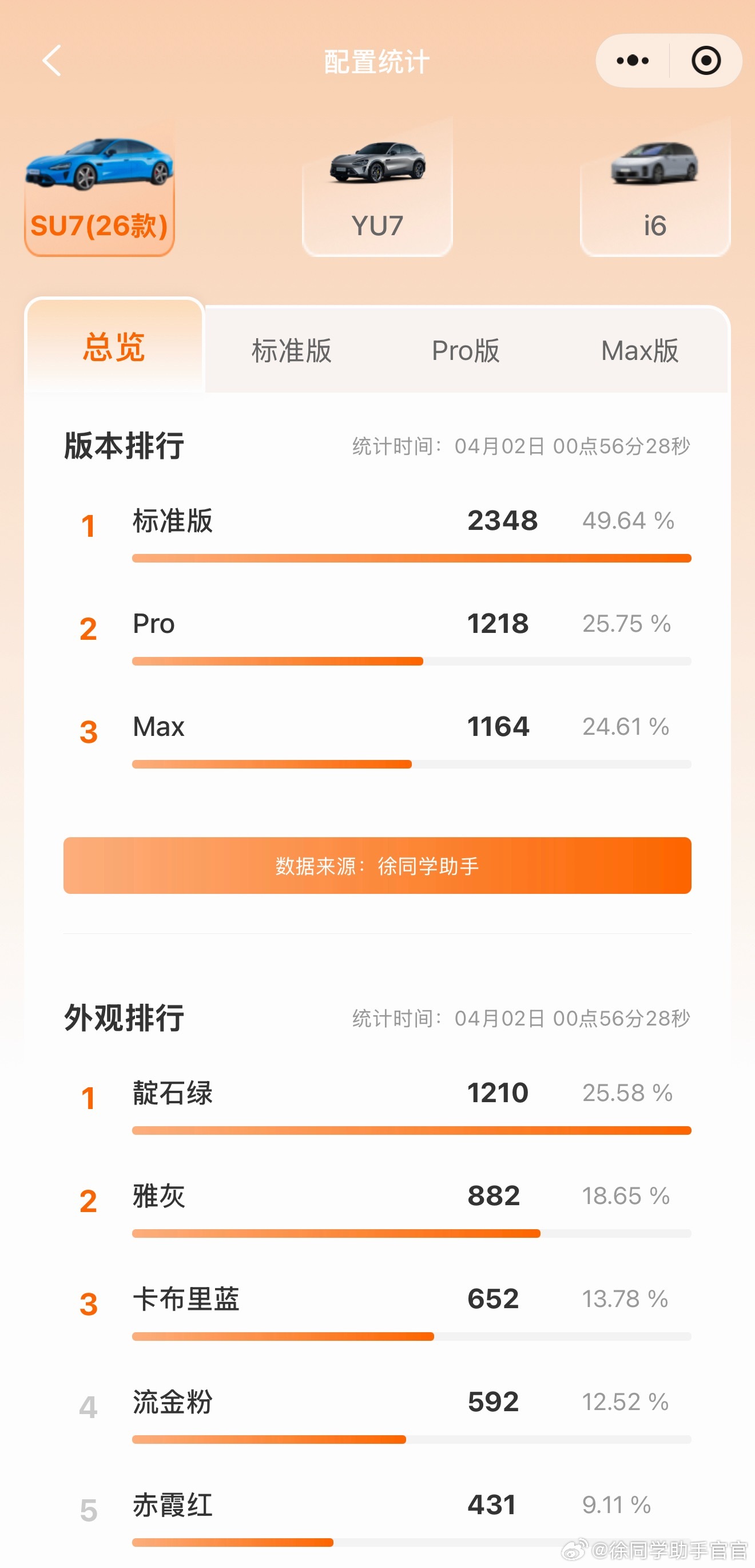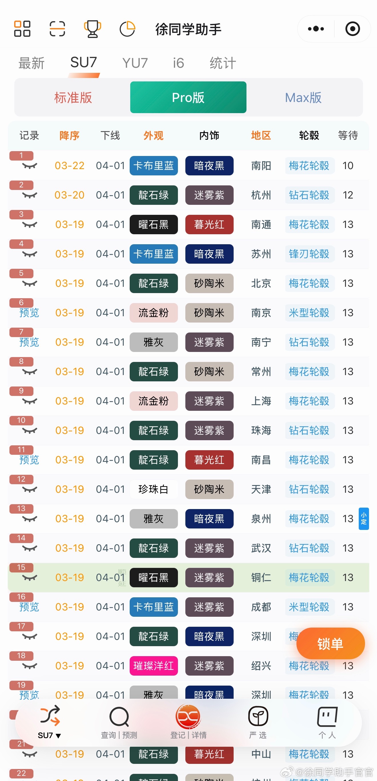 📈下线进度1️⃣小订下线以剩余周数2-5周的为主,标准版的卡布里蓝集中生产了一批,pro版雅灰挺多的,max版以新色为主。2️⃣老带新这几天集中生产下线,很多等了半年的准车主终于开始收到通知了,也包括3.20锁单的。3️⃣大定优先级排在最后,比小订用户晚交付两周左右。
