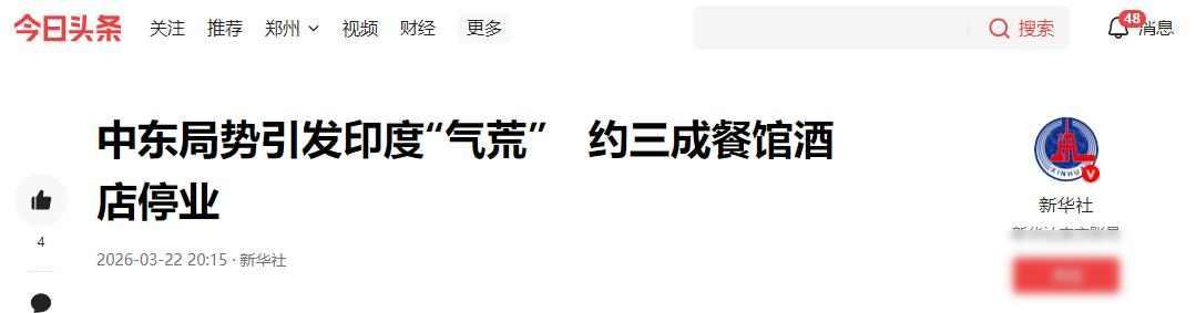 厨房排长队,气罐抢到打架,一个大国的能源命门被掐住了 2026年3月中旬,霍尔木兹海峡的油轮突然减少九成,不是因为船坏了,而是人们不敢走那条路,印度的液化气供应跟着断了,孟买和新德里的街上,老百姓提着空罐子排起百米长队,有人一等就是半天,黑市上,原本15公斤的气罐卖到原来三倍价钱,还是很难买到。 穷人家的日子更不好过,北方邦每天停电八小时,工厂停工,工人只能回家待着,贫民窟里的人用竹竿绑上铁钩去勾高压线,这不是胆子大,是因为没电做饭、没灯照明,孩子写作业要靠蜡烛,冬天取暖得烧塑料袋,有人触电死了,新闻里提一句,过两天就没人记得。 印度依赖中东供应85%的原油和80%的天然气,这些能源必须经过霍尔木兹海峡运输,没有其他替代路线,国内储备也极为有限,战略石油储备仅能维持10到15天,天然气储备几乎为零,相比之下,日本和中国都拥有超过百天的能源储备,印度却连一个月都无法支撑,它长期将经济增长置于安全之上,导致危机来临时毫无缓冲余地。 最要命的是化肥供应断了,印度一年要用两千多万吨尿素,一半靠进口,另一半靠国内生产,而国产尿素八成原料是天然气,气一停,化肥厂直接停工,三分之一产能没了,农民买不到肥料,春耕就卡在关键时候,旁遮普邦和北方邦已经有人砸仓库抢化肥,警察来了也拦不住,专家说四月份前补不上缺口,粮食至少减产两成,两亿多人吃饭会受影响。 印度政府这下脸上挂不住了,莫迪之前对中国尿素征收反倾销税,还强调不能太依赖外国供应,结果三月底突然改口,急忙向中国、俄罗斯和摩洛哥求助货物,央行开设了能源应急贷款窗口,资金虽然批下来了,但运输船迟迟不到,有钱也解决不了问题,以前高喊自力更生的外交辞令彻底失效,如今连临时借货都得低声下气。 偷电这件事,早就不是什么新鲜话题,印度全国有百分之二十七的电是被人偷走的,每年因为偷电死掉的人超过一万个,这次危机来了以后,偷电反而变得更厉害,不是老百姓不知道法律,是因为电网太差,电费太高,报修又慢,走正规的路子根本行不通,只能冒险去偷,再看中国这边,煤改气之后就有双电源做保障,哪怕气站停了,还能马上切换回煤电,整个系统有备用方案,但印度这里呢,只有一条线路硬撑着,一断就全完了。 3月22日,新华社提到有三成餐饮酒店关门,30号光明网说经济情况一个月内急转直下,这些都不是预测,而是实况直播,到现在4月2号,印度政府还没有给出恢复时间表,化肥供应缺口还在扩大,农村地区抗议活动越来越多,有的地方开始发放救济粮,但数量太少,解决不了问题。 有人提出印度为何不早些修建管道的问题,答案在于成本太高难以承担,各方条件始终谈不妥,加上地区局势复杂多变,当初选择这个方案时谁都没料到会引发严重后果,如今问题暴露出来,才意识到所有临时应对措施都是在拿国家命运做赌注。 排队的人还在等着,气罐慢慢变轻,竹竿渐渐伸得更远。 没人知道下一次断供什么时候会来,大家只能等着看事情怎么发展。