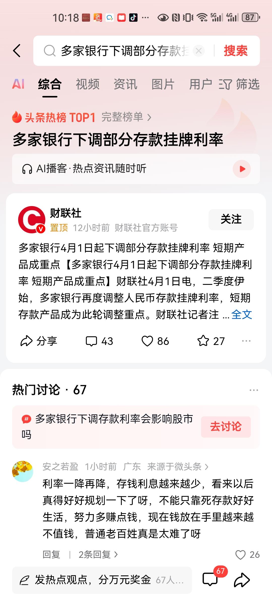 在春节过后,也就是银行例行的开门红活动结束后,有些银行达成了预定的存款目标。那么就将对现有的存款利率进行优化调整,目的就是挤出高息存款,用更低成本的存款来代替。所以看到例如厦门银行、福建海峡银行这类中小银行,但是在本地区域又有着比较大的影响力的银行,开始下调挂牌存款利率,尤其是针对小众的7天通知存款利率进行下调,下调幅度高达0.35%。 但是同样也看到,有自身存款余额不足的一些银行,还在发布一些相对高一点利率的存款,比如一些新型银行,一些农商行和城商行,所以从第2季度开始,各家银行可以根据自己的经营目标和经营压力进行调整。 民众无需恐慌,但是通过近4年的存款利率下调,大家也要明白,民众选中存款核心需求是保障资金的安全,如果想通过存款实现所谓财富保值增值的需求,那从现在到未来都不可能存在了。另外,存款也仅仅只能保证资金的安全,连未来的现金流匹配使用也很难保证,可能需要通过一些年金产品,储蓄类的保险产品才能实现。 那么在存款利率日渐减少的当下,你准备如何调整财富配置呢?