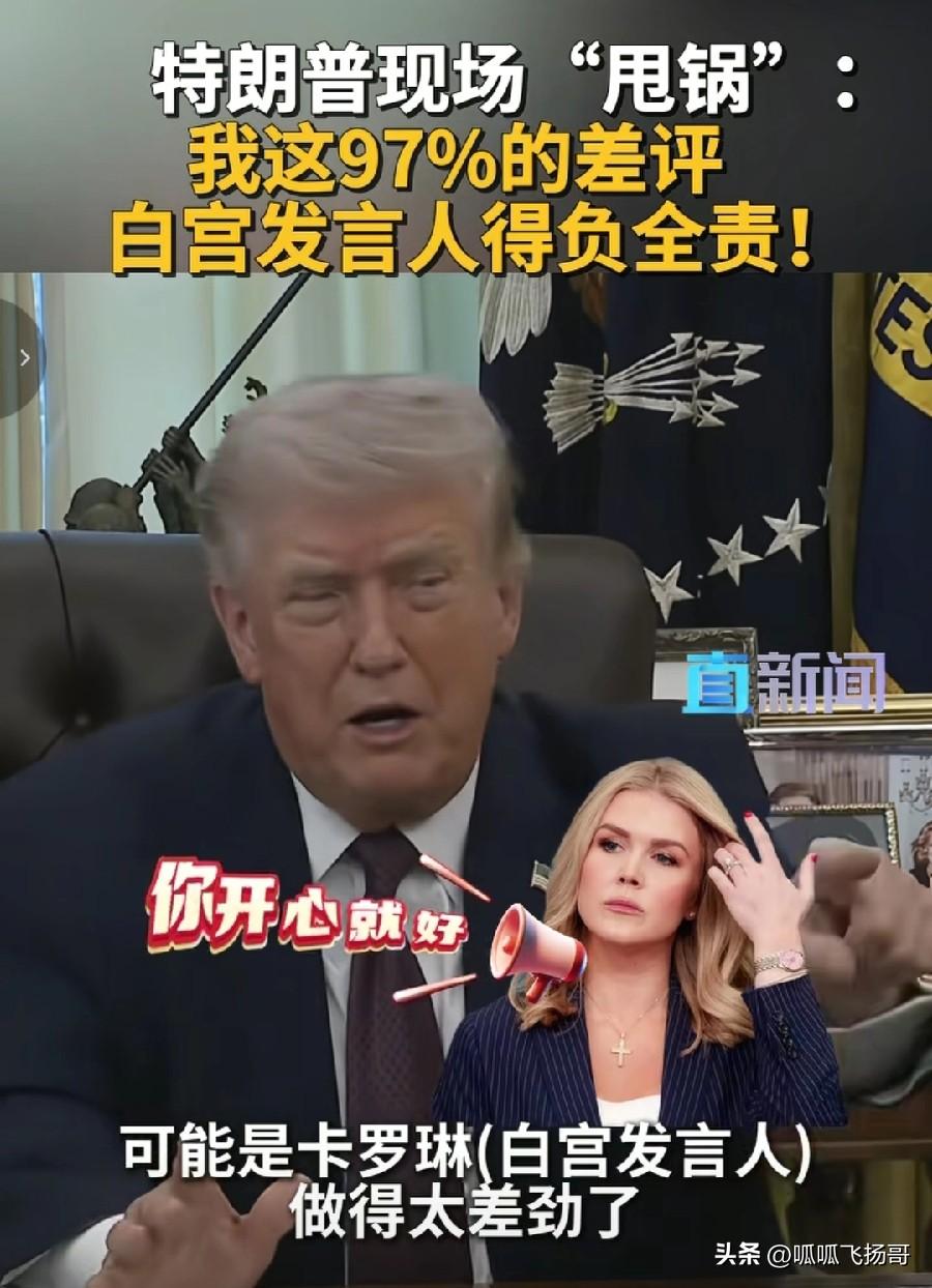 对白宫发言人卡罗琳来说,这简直就是人在家中坐,祸从天上来。 特朗普竟然将自己有93%的负面报道甩锅给发言人卡罗琳,责怪发言人卡罗林做的差劲! 卡罗琳,白宫新闻发言人, 长相甜美,年轻漂亮, 回答记者提问口齿伶俐,思维敏捷,多次在白宫替特朗普解围。 最让人印象深刻的是美军的用战斧导弹袭击伊朗的一个小学造成大量学生死亡 , 特朗普张口就说是伊朗自己干的 ,有记者明确指出伊朗有图片证据是战斧导弹,战斧就是美国造,可以说是美军袭击了伊朗小学板上钉钉。特朗普又说其他国家也有买战斧。 这明明就是睁眼说瞎话,记者接着就转头把问题抛给卡罗林, 卡罗琳一句话就将这个棘手的问题轻松化解,她说“总统有权分享他的看法”, 这句话非常巧妙的维护了总特朗普总统的绝对正确,还让记者无懈可击 。 这么聪颖智慧替总统解围的卡罗琳,没想到并没就得特朗普的青睐。 据美媒报道,3月31日,特朗普在白宫坦言自己有93%的负面新闻 , 有人说是97% , 接着特朗普画风一转,说一个人如果97%都是负面的话,那就是发言人(卡罗琳)做的太差劲了。 这就是特朗普,说任何话都是张口就来 , 反正自己永远都是优秀的都是正确的,错都是别人带来的。 如果记者将这个问题抛给卡罗琳, 以卡罗琳的风格,她可能会这样回答:这就是总统的可爱,我们的总统非常爱护他的员工, 他总是这么幽默有趣。 特朗普最好还是不要过分的责怪卡罗琳, 卡罗林来当白宫发言人并不是因为钱, 她老公可是有钱人,虽然60多岁了。 如果卡罗琳一生气 学前情报部长肯特辞职,抖一下白宫的黑料,特朗普就得不偿失了 。