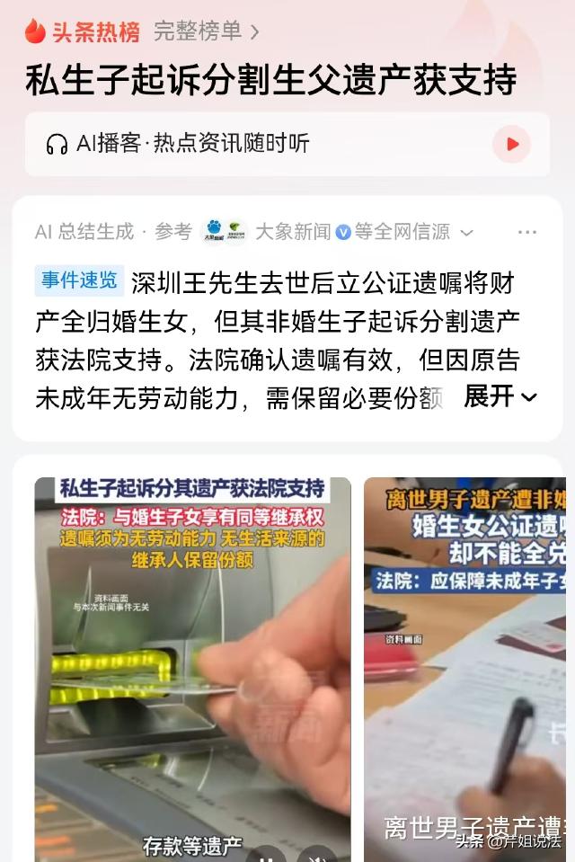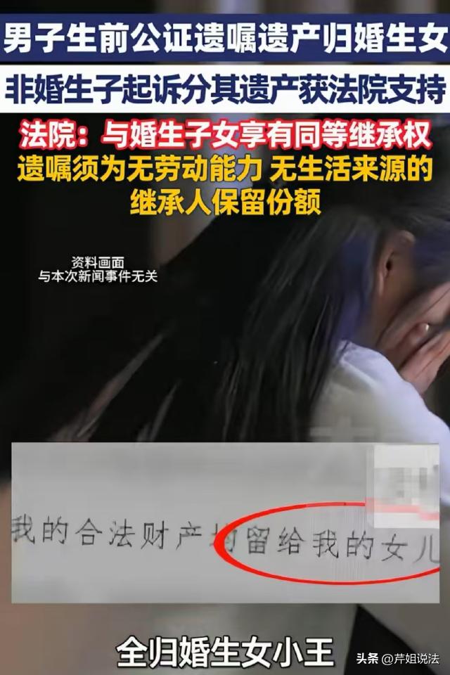 广东深圳,男子留下遗嘱,每年从遗产中拿出10万赡养母亲,剩余财产全部留给女儿。男子离世后,一个孩子突然冒了出来,将男子的母亲及女儿起诉了,要求继承男子的遗产,让人没想到的是,他的诉求竟然得到了支持,这是怎么回事呢? 来源:,大象新闻 王先生家产颇丰,虽然算不上顶级大富豪,但房子车子,存款应有尽有。 王先生和妻子感情深厚,二人还孕育了一个女儿,在外人看来,王先生一家非常幸福。 可2024年,王先生身体出现了问题,王先生自知时日无多,于是立下了一份遗嘱。 遗嘱中说明,等他走后,每年从他的遗产中拿出10万赡养他的母亲,剩余的房子,车子,存款、股票、基金等等,全部留给他的女儿。 2024年的6月,王先生走了。 家人帮他办理了后事,然后就开始着手办理继承手续。 谁知道就在这个时候,他们突然收到了一纸传票,起诉他们的是一个从来不认识的人,此人声称自己是王先生的私生子,要求继承王先生的部分遗产。 王先生的家属不能接受,因为此前王先生家庭和睦,家人之间关系融洽,他们不相信王先生竟然背着他们和其他女人有染,更不相信他还有其他孩子。 但是那个原告言之凿凿,说话有理有据,让他们不得不信。 据原告说,他的母亲和王先生是在2016年相识的,随后两人发展为了男女朋友关系,不久,原告出生了。 但是因为王先生已经有了家室,原告的身份一直没有被公开。 原告认为,虽然他是私生子,但是法律规定,非婚生子和婚生子的地位是一样的,都拥有继承权,所以他有权继承王先生的部分遗产。 对此,王先生的家属认为,王先生已经不在了,难道原告说他是王先生的孩子,他就是王先生的孩子吗?必须要拿出证据! 退一步讲,就算他是王先生的私生子,王先生生前已经立下了遗嘱,所以,他的遗产应该按照遗嘱进行分配。 庭审中,双方争的不可开交。 那么从法律角度来分析,这个孩子是否拥有继承权?他又能否如愿分得遗产呢? 首先可以肯定的是,王先生的遗嘱是符合程序的,具有法律效力。 《民法典》第一千一百三十三条规定,自然人可以依照本法规定立遗嘱处分个人财产,并可以指定遗嘱执行人。自然人可以立遗嘱将个人财产指定由法定继承人中的一人或者数人继承。 王先生立遗嘱的时候虽然病危,但他意识清醒,具有完全民事行为能力。 王先生立下遗嘱,每年从遗产中拿出10万赡养母亲,剩余财产留给女儿,这是他对自己财产处分的意思表示。 并且,王先生所立遗嘱内容不违反法律、行政法规的强制性规定,也不违背公序良俗。 所以,不管是从形式还是从内容上看,这份遗嘱都具有法律效力。 既然王先生的遗嘱具有法律效力,私生子是否就不能分得遗产呢? 《民法典》第一千一百二十七条,遗产按照下列顺序继承:第一顺序为配偶、子女、父母。这里所说的子女,包括婚生子女、非婚生子女、养子女和有扶养关系的继子女。 所以,私生子和婚生子在法律地位上是平等的,都拥有继承权。 虽然王先生立下了遗嘱,但《民法典》第一千一百四十一条规定,遗嘱应当为缺乏劳动能力又没有生活来源的继承人保留必要的遗产份额。 王先生离世时,他的私生子还未成年,属于缺乏劳动能力又没有生活来源的情况。 所以,即便王先生有遗嘱,也需要为这个私生子保留必要的遗产份额,不能完全按照遗嘱将所有剩余财产都留给女儿。 果然,原告是有备而来。庭审中,他拿出了一份亲子鉴定报告,里面明确写明,他和王先生从生物学角度来讲,属于父子关系。 一切都很明了,最终一审认为,王先生的遗嘱具有法律效力,但是原告作为非婚生子,同样拥有继承权。 并且原告属于未成年,没有劳动能力,又没有稳定的收入来源,在保障遗嘱部分执行的同时,也应该为他保留适当的遗产,以保障他基本的生活和成长需求。 最终,一审酌定保留一部分的遗产份额由原告继承,原告超出该金额的部分不予支持。 私生子是否应该和婚生子一样拥有继承权?对此,您怎么看?