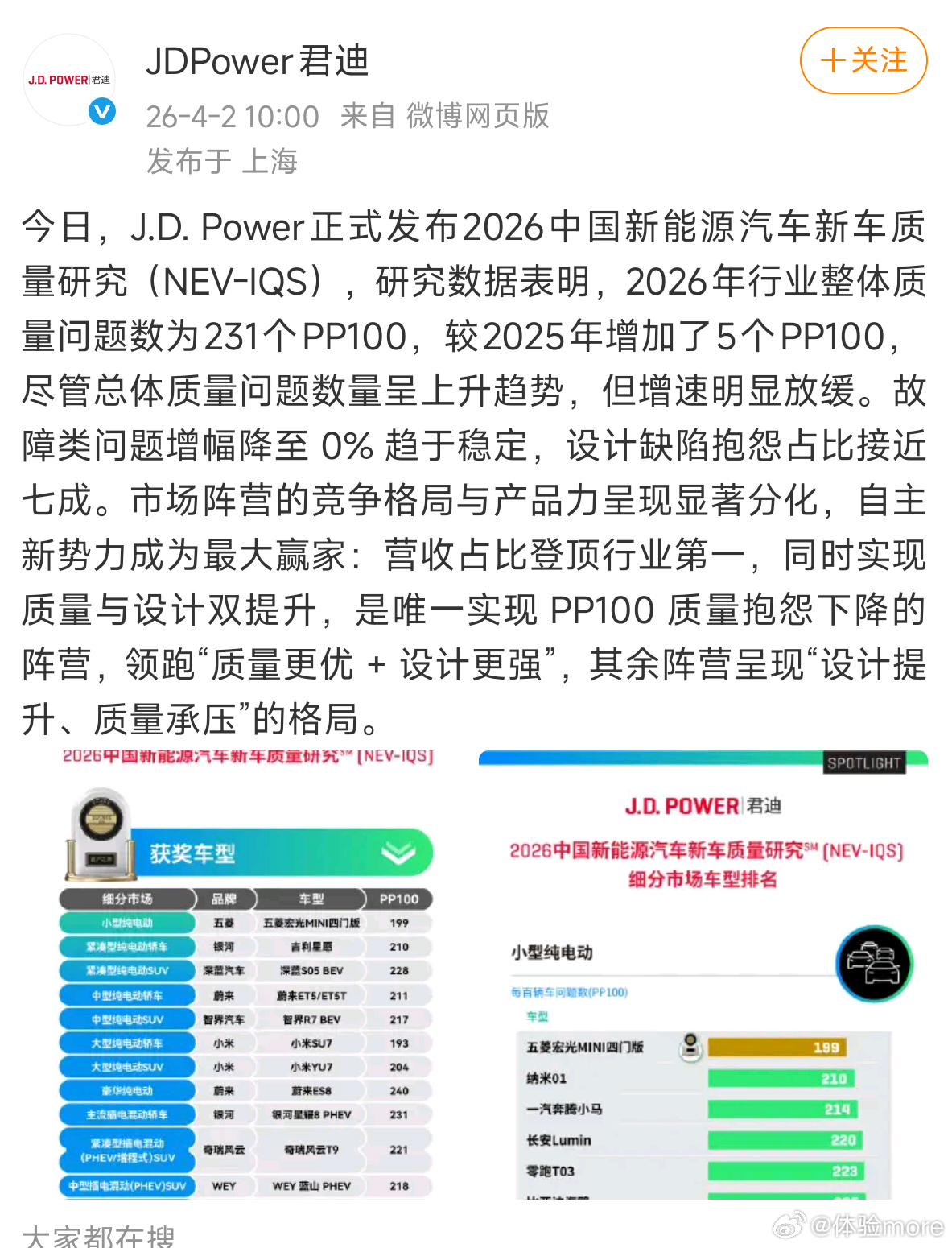 这个研究以 PP100(每百辆车问题数)为核心指标,数值越低越好,代表车主对车辆的不满越少,从而反映出车的质量和品控更好。