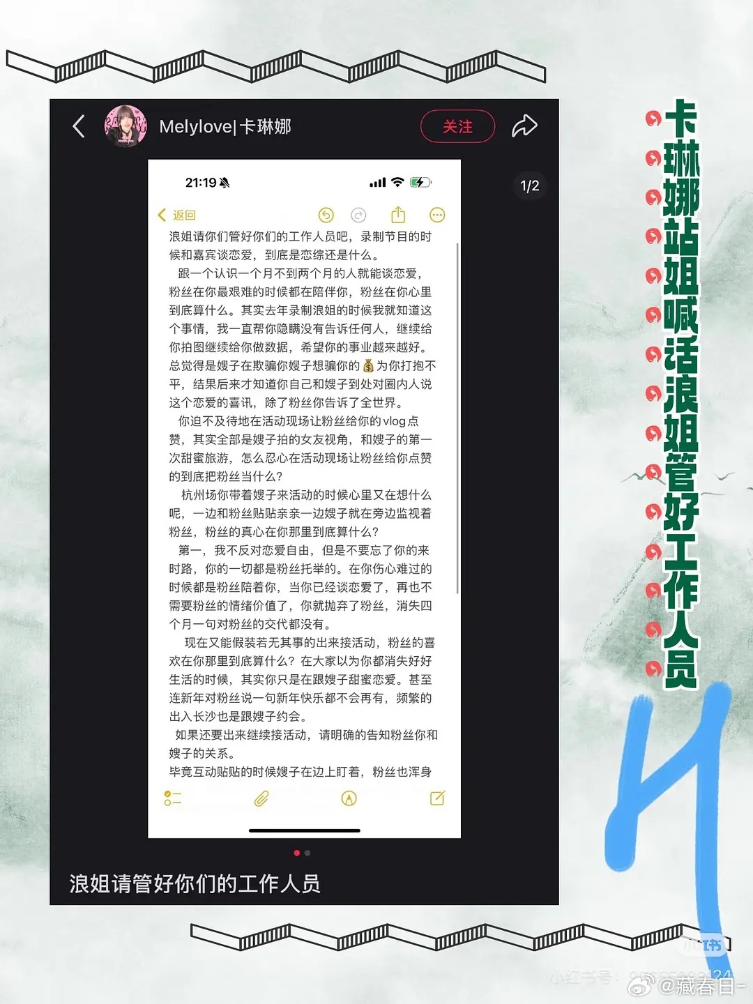 我靠这是啥意思,卡琳娜站姐喊话:不满艺人录制浪姐时与嘉宾恋爱,却对粉丝隐瞒,对圈内人公开,还在活动现场让粉丝点赞女友拍的恋爱vlog(粉丝知道是恋爱vlog吗),带女友到活动现场监视粉丝互动,恋爱后消失四个月又若无其事复出
