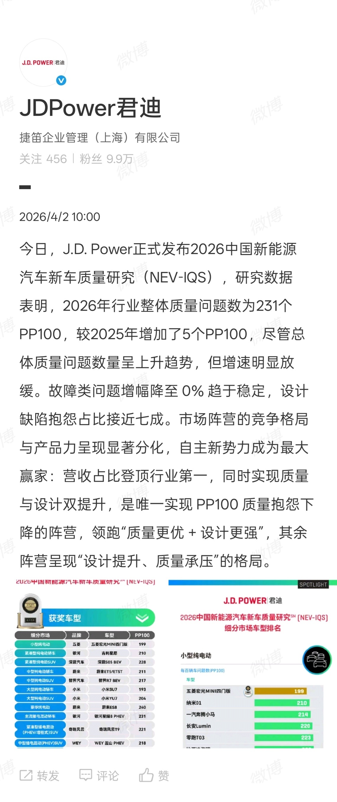 今日,权威调研机构 J.D. Power 正式发布 2026 中国新能源汽车新车质量研究(NEV-IQS)榜单。其中,小米 SU7、小米 YU7 覆盖『质量』和『魅力』两项关键评价维度第一。现在,小米汽车已经在产品可靠性、用户满意度、品牌认同感等方面全面领先!