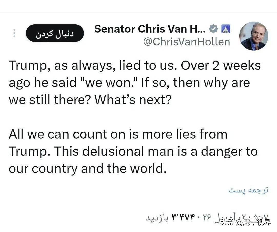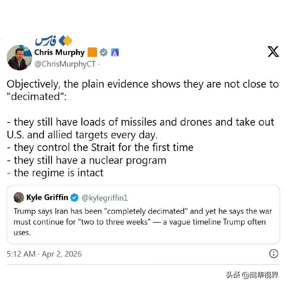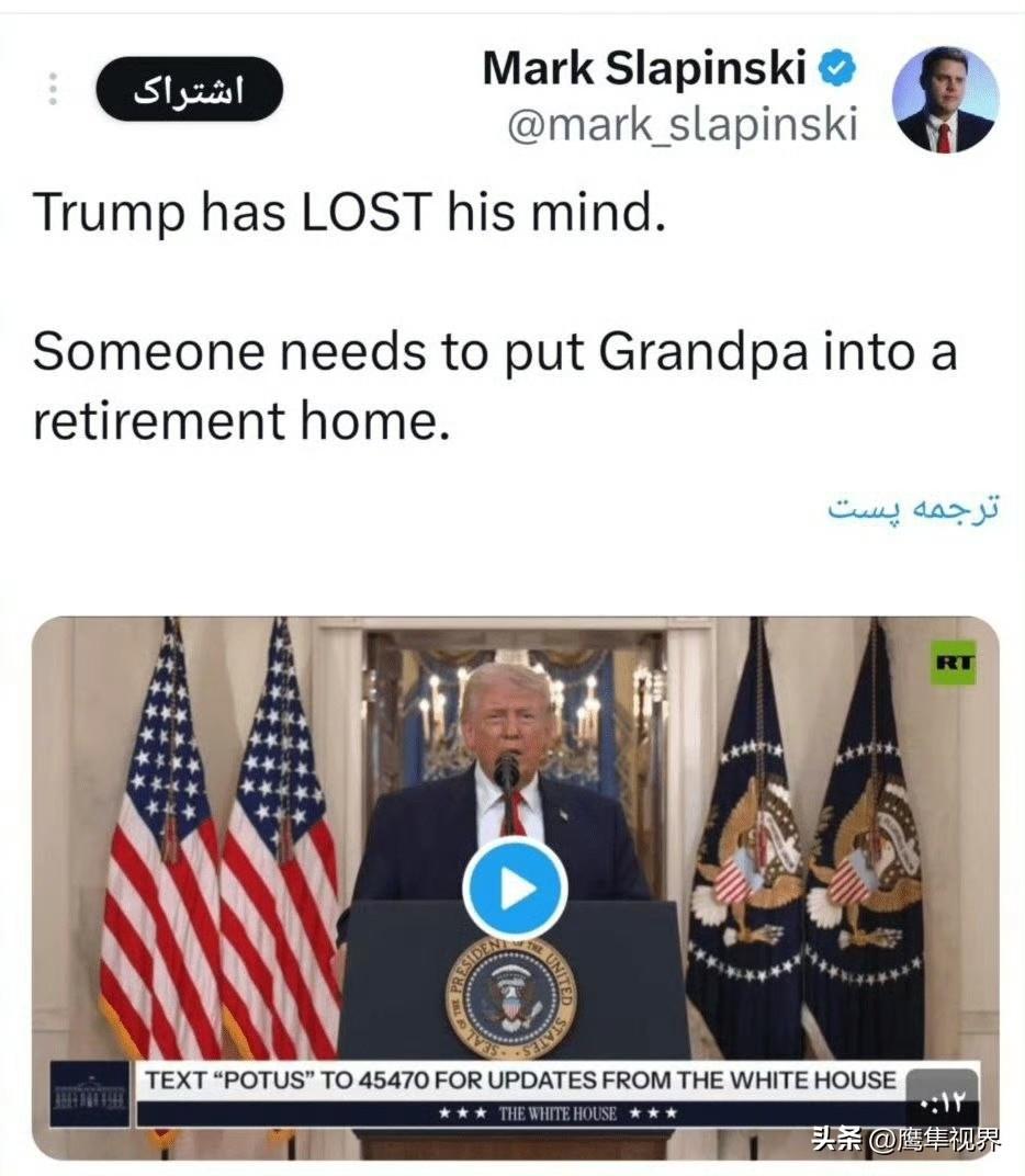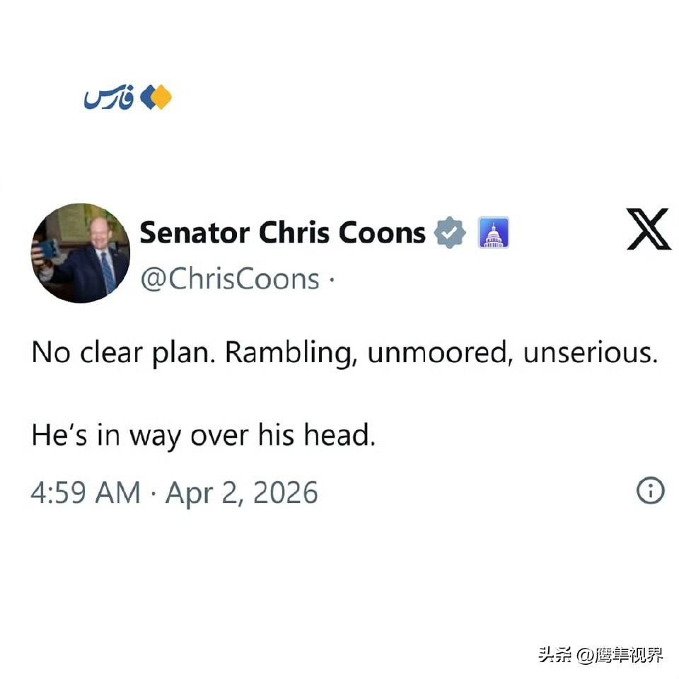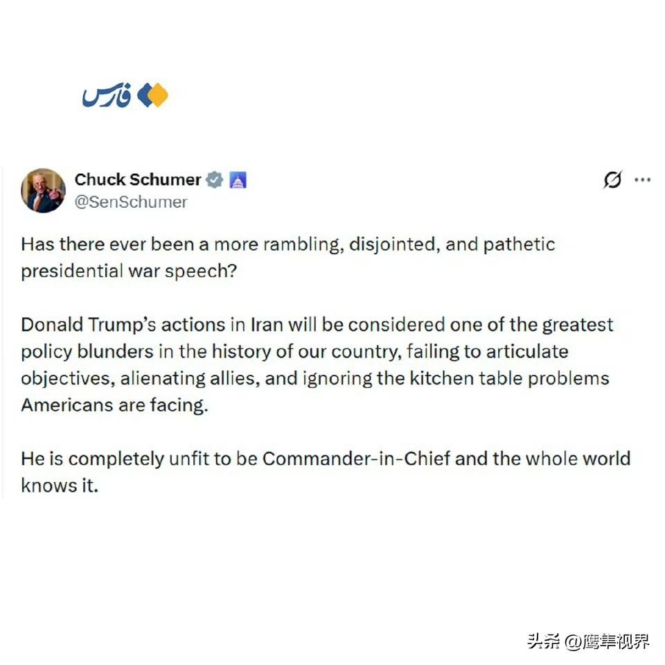 BBC 分析师布什里·谢赫:“我之前误判了特朗普演讲的重要性,我想为让你们参与预测特朗普演讲内容而道歉。我曾短暂地以为我们面对的是一位真正的总统,而不是一个真正的小丑,我错了。特朗普不过是美国的一个彻头彻尾的耻辱;他那无脑无智的演讲证明了这一点。”美国参议员克里斯·库恩斯:“没有任何清晰的计划,空谈连篇、立场不稳、态度不严肃。他完全处于超出自己能力的状态。”美国参议院民主党领袖舒默:“总统的战争演讲何时曾如此散乱且令人沮丧?特朗普在伊朗的行动将被视为我国历史上最大的政策失误之一,因为他未能明确阐述目标,疏远了盟友,并忽视了美国民众的日常困境。他完全不适合担任美国三军统帅,全世界都清楚这一点。”美国参议员克里斯·墨菲:“简单证据表明我们远未接近削弱伊朗:伊朗拥有大量导弹和无人机,每天都在瞄准美国及其盟友的目标。伊朗首次掌控霍尔木兹海峡。伊朗仍拥有核计划。伊朗政权依然稳固。然而特朗普在今天的演讲中声称:伊朗已被严重削弱,所剩无几。”美国议员克里斯·范·霍伦:“特朗普一如既往地对我们撒谎。两周多前他说‘我们赢了’,如果真是这样,那为什么我们还在这里?下一步是什么?我们唯一能期待的就是特朗普更多的谎言。这个妄想症患者,对我们国家和世界都构成威胁。”美国政治记者兼分析家马克·斯拉平斯基:“他失去了理智;该有人把这位祖父送进养老院了。”