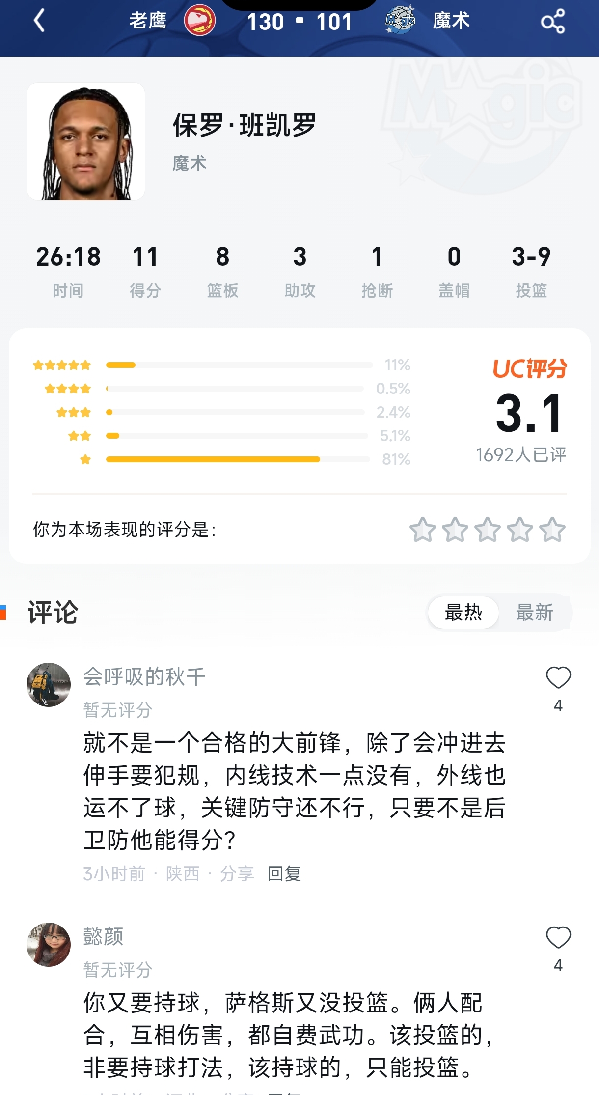 就在三天前,班凯罗还场均贡献出35分6.3篮板6助攻的出色数据,在赛后采访中自信满满地说:“就是保持侵略性,也没什么特别的。我只是打出了自己应有的水平。”可谁也没想到,这位刚刚签下五年2.39亿美元超级顶薪的魔术当家球星,在4月2日面对老鹰的关键卡位战中,交出了一份“炸裂”表现——只不过,是炸裂得让球迷心态崩了。 🔥 UC评分区——火速出警,3.1分惨案现场 比赛结果:老鹰 130 - 101 魔术 球员数据:保罗·班凯罗(魔术) 上场时间:26分18秒 得分:11分 篮板:8个 助攻:3次 抢断:1次 盖帽:0次 投篮:3投9中 UC评分:3.1分(1692人已评) 评分分布: 5星:11% 4星:0.5% 3星:2.4% 2星:5.1% 1星:81% 评论区热评: 会呼吸的秋千(陕西):就不是一个合格的大前锋,除了会冲进去伸手要犯规,内线技术一点没有,外线也运不了球,关键防守还不行,只要不是后卫防他能得分?(4赞) 懿颜:你又要持球,萨格斯又没投篮。俩人配合,互相伤害,都自费武功。该投篮的,非要持球打法,该持球的,只能投篮。(4赞) 📊 从数据看“灾难现场” 咱们先不说球迷的“暴风骤雨”,单看这份数据单,就能感受到3.1分的“含金量”。 9投3中,三分1中0,命中率仅33.3%,还送出了3次失误,正负值-18。对比他本赛季场均21.8分8.5篮板的全明星级别数据——这个差距,就像你预期吃一顿满汉全席,结果端上来的是两碗白粥配咸菜。不仅是班凯罗自己低迷,整支魔术也像集体“熄火”:外线32投仅6中,命中率不足20%。更扎心的是,对手老鹰的杰伦·约翰逊全场轰下18分14篮板8助攻,直接打爆了对位的班凯罗。这一战之后,老鹰完成对魔术的赛季四杀,魔术遭遇了近10场输掉的第8场比赛。 一位虎扑球迷的点评直戳痛点:“一旦进攻造不成杀伤,对自己投篮没信心,进攻就不知道怎么打了,防守其实防约翰逊到位了,但是还进,心态就更崩了。” 🔍 一场比赛背后的“连锁反应” 这场比赛不是普通的常规赛——它是东部排名卡位战。魔术此前刚通过一场胜利稳住了东部第八的位置,可这场惨败让他们冲击东部前六的希望变得非常渺茫。而老鹰这边三连胜势头正猛,杰伦·约翰逊带领球队在最近10场比赛豪取8胜。更加令人唏嘘的是,班凯罗在三天前接受采访时还在谈冲击季后赛的前景:“我们不希望掉入附加赛,所以我们必须要想办法摆脱困境。”但这场关键战役,他交出的答卷显然与领袖的期待相去甚远。 其实,早在全明星落选时,班凯罗就坦诚地说过:“我知道自己是这个联盟的全明星级别球员。但这个赛季我确实没有打出真正配得上全明星的表现。”虽然之后他一度打出场均26.2分9.2篮板的数据试图“打脸”质疑,但进入四月后,面对老鹰和猛龙(此前对阵猛龙14投仅3中只拿到9分5篮板),他连续打出两场“铁血”表现,状态如过山车般起伏不定。 💡 三分点评:不只是“低迷”那么简单 球迷的愤怒不是没有道理——3.1分在UC评分区意味着什么?超过八成的人打了1星。但这背后反映的问题可能比一场比赛的得失更深。 第一,定位模糊正在吃掉天赋。 从评论中不难看出,球迷对班凯罗的核心诉求非常一致:你一个大前锋,天天拿着球往人堆里冲要犯规,外线又运不了球,防守端还被无限点名——你到底想打什么位置?正如一位深度分析指出,班凯罗具备巨星潜质但表现不稳定,数据好看但场上观感不佳,魔术对他的定位一直不够清晰。 第二,进攻选择与心态是硬伤。 当投篮信心被摧毁时,班凯罗的进攻套路就变得极其单一——硬突、造犯规、打铁、沮丧。而偏偏他面对的还是东部季后赛级别的防守,杰伦·约翰逊和戴森·丹尼尔斯的轮番“教育”,让他的每一次进攻都像在打铁教室上课。 第三,魔术整队“化学反应”还在找。 萨格斯没有稳定投射,贝恩与小瓦格纳也在各自挣扎,整支魔术似乎还没有找到一套能让班凯罗彻底发挥的体系。从球员到球迷,所有人都在等一个答案:五年2.39亿,到底买来了一个什么级别的班凯罗? 比赛结束了,但魔术的赛季还没结束。班凯罗还能不能在常规赛收官阶段带领球队打出该有的表现,将是检验这位亿元先生成色的最后“大考”。球迷们的3.1分,是情绪,更是期待——他们都想看到那个真正的班凯罗,打出配得上身价的篮球。