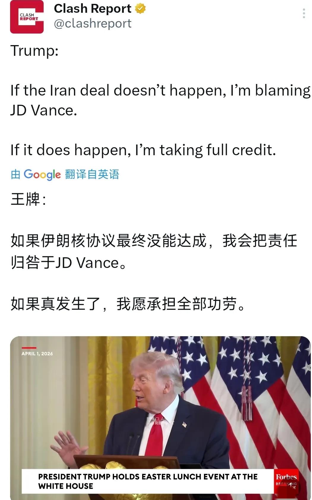 特朗普雷人表态:美伊协议谈崩责任归万斯,反之功劳归自己 北京时间4月2日,特朗普在接受采访时抛出一句极具争议的表态:“如果和伊朗的协议最后谈崩了,那就是JD万斯的责任。如果真这样,我愿意把所有的功劳都揽到自己身上。” 这话甫一出口,就让人一眼看穿他的如意算盘——把关乎中东稳定与国际社会关注的美伊核谈判,直接当成自己个人政治操盘中的一颗棋子。 美国现在一边考虑和伊朗通过间接方式重新摸底谈判,一边又不断向中东地区加大军事部署,外界明里都说只是“预防”,私下却没人敢排除美军随时对伊朗动手的可能。 而副总统JD万斯,这段时间一直是白宫和伊朗方面沟通的主力,就在几天前还有消息称,美方打算在巴基斯坦促成停火谈判,万斯本人也会亲自出席,足见美方对他的信任。 从实情来看,万斯其实就是被推到前台专门“擦屁股”的负责人,可特朗普如今的套路再熟悉不过:但凡形势有好的一面,他就等着摘果子,可如果陷入僵局,第一个被推出挡枪的肯定不是自己。 过去几个月,特朗普对伊施压手法频繁换挡——前脚还放狠话威胁空袭,还给过伊朗48小时的“最后通牒”,后脚一看局势不利,又急忙降温,甚至两度推迟军事行动。当初说是伊朗主动求和,实际上是美方不敢深陷泥潭。 实际战况可见端倪。美以联手对伊朗发动长达一个多月的空袭,结果不仅没能击垮对手,反倒屡屡被反击——伊方80余轮导弹、无人机反制,200多架美以战机蒙受损失,美军的“拳头装备”战斧导弹都快打光了。 国内经济压力持续升高,油价飙涨四成,民众反战情绪越来越严重,这种情况下谁还真敢轻举妄动? 特朗普当然更怕抗不住选民的压力,所以把希望寄托在谈判止损。他自己不愿意承担风险,把谈判重担都扔给副总统万斯,然后提前撂下一句甩锅的话——无论哪种结局,自己都是赢家。 谈判成了,他是英雄,失败了,有背锅侠顶着,自己全身而退,还能顺带把公众的不满引向万斯。这种操作,简单明了,却让人看得清清楚楚。 说到底,在特朗普眼里,外交从不是为了追求和平或者彰显大国责任,只是他给自己谋取更多政治资本的一项筹码。 这么多年,无论是处理欧洲盟友,还是应付全球事务,利益永远先于所谓的道义和共同体。 比如约束英国等盟友自己去霍尔木兹海峡“抢油”,美国只负责赚钱,遇到危险就置身事外。 类似剧本在委内瑞拉、巴拿马等地早就上演过——制造危机,极限施压,最后甩手走人,全然不顾局势走向。 如今这种思路延续到伊朗问题上,不论是副总统还是欧洲盟友,说牺牲就牺牲,特朗普只想保住自己的政治安全网。这种做派不仅使得美国的国际形象一跌再跌,也让外界彻底认清了他“只为自己考虑”的底色。 以色列和美国的默契也逐渐失衡,以色列试图借力“清除心腹大患”,美国反手却开始找机会脱身,双方的裂缝越拉越大。 如此看来,特朗普的用人和甩锅逻辑基本贯穿始终。他根本不关心谈判力所能及的大局稳定,更没兴趣为美国树立什么世界领导者形象。 对他而言,能多拿一张政治王牌比一切都重要。这种操作风格,注定让美国在复杂的中东局势中越陷越深,也让盟友对美国失去了信任和期待。 短期而言,谈判能否达成依旧存疑,但一场“甩锅大戏”,早已静悄悄地摆在了所有人面前。 聊特朗普 特朗普雷人言论