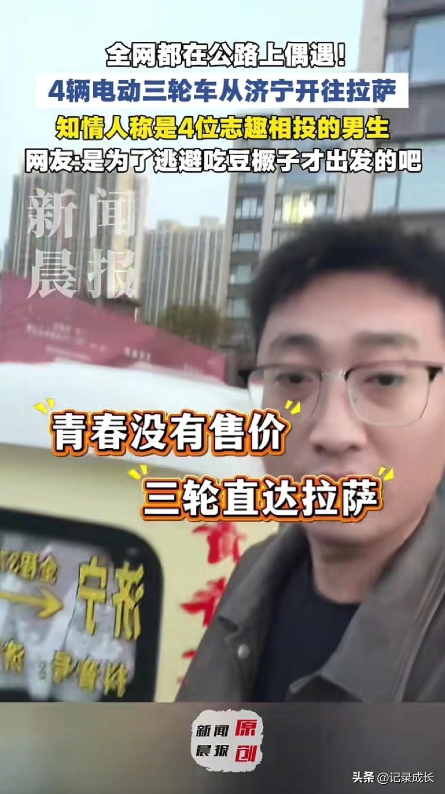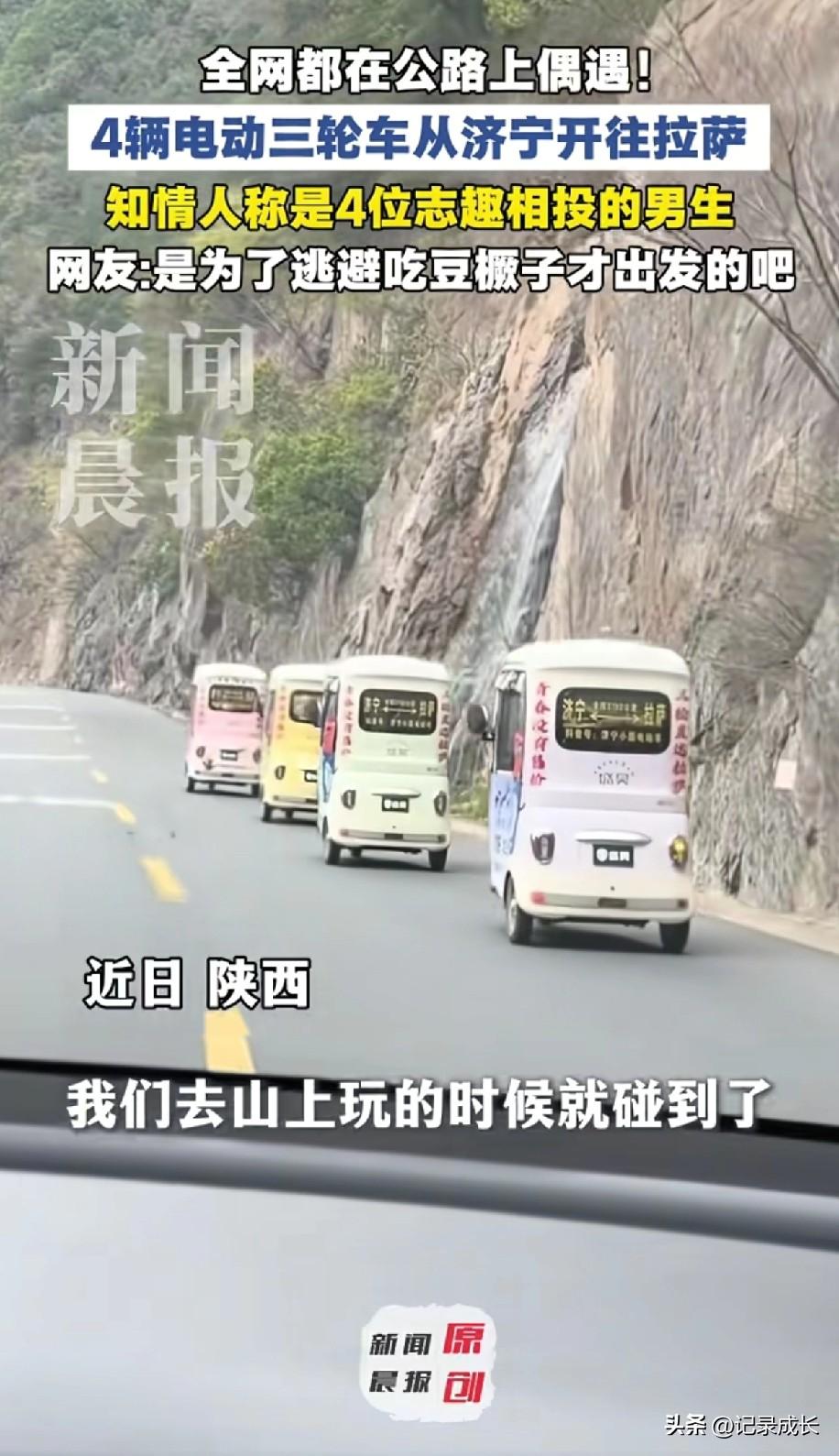 青春没有售价,三轮直达拉萨 四辆电动三轮车从济宁出发,目的地拉萨,全程3792公里,目前已经到陕西, 估计电三轮改装过了,假设一天能跑个200多公里,一天充电一次,再加上中途休息,最多一个月就到拉萨了 还有人担心路上没有交警查吗,他们肯定出发前就已经做好攻略了 真羡慕这种不用上班没有压力的土豪人,人家说去哪就能去,很多人连去外出旅游的想法,都得好好的花时间规划 所以说还得努力攒钱吧