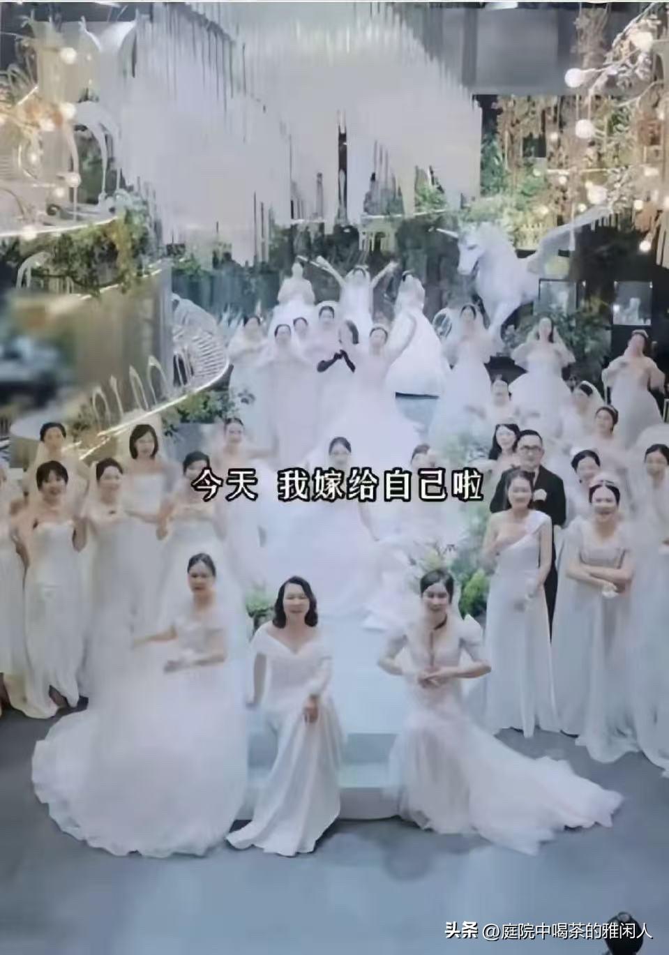 以为是段子,居然是真事!一群“老仙女”不是不想嫁,不是嫁不掉,而是非要“嫁给自己”。真的没有半点嘲讽的意思,就是心里挺感慨的。 个人觉得婚纱从来不是因为多华丽多昂贵才动人,是穿着它,满心欢喜走向心爱的人,那份奔赴和期待,才最珍贵。可现在很多女生穿婚纱,对面空无一人,精心摆拍、修图发圈,看着满屏的点赞和祝福,仪式感拉满,流程走完,日子还是照旧过。说不尴尬是假的,看着别人成双成对,自己独自站在镜头前,心里难免会空落落的。 只是比起被人看穿“没人相伴、没等到良人”的孤单,不如给自己找个高级的借口,把孤单包装成独立,把等待的无奈,说成是主动选择嫁给自己。说到底,哪里是真的嫁给了自己,不过是嫁给了那个不愿承认孤单、不想妥协将就的自己。 不过,每个人都有自己的活法,能说服自己坦然过日子,也是一种本事。只是偶尔会觉得,这份看似洒脱的背后,藏着太多女生的心酸和逞强罢了。 大家怎么看待这种“嫁给自己”的仪式呢?是真的独立,还是体面的逞强?