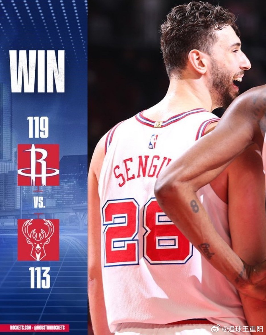 NBA 常规赛,休斯顿火箭对阵密尔沃基雄鹿。半场火箭54-44雄鹿,最终火箭119-113雄鹿。