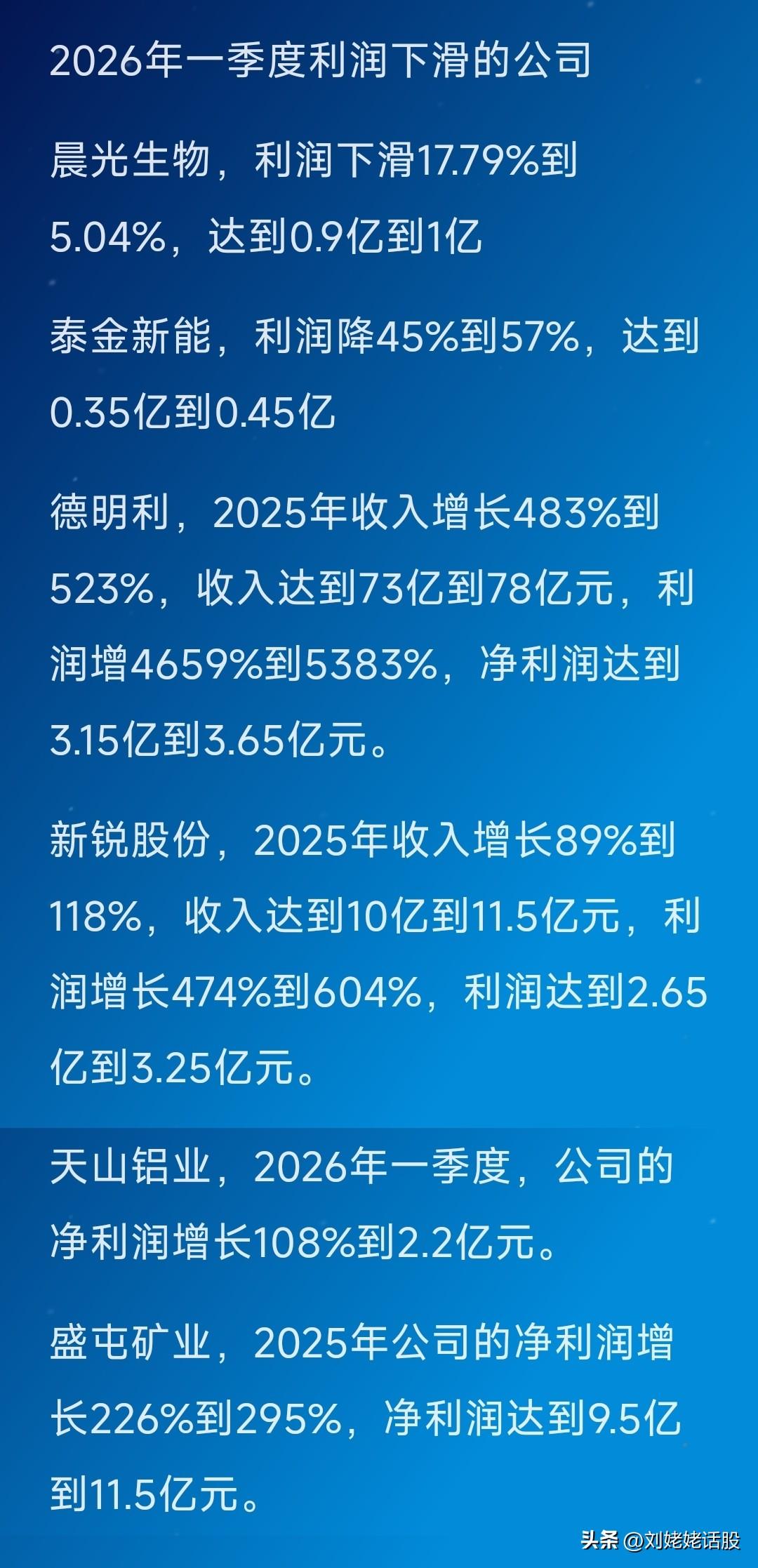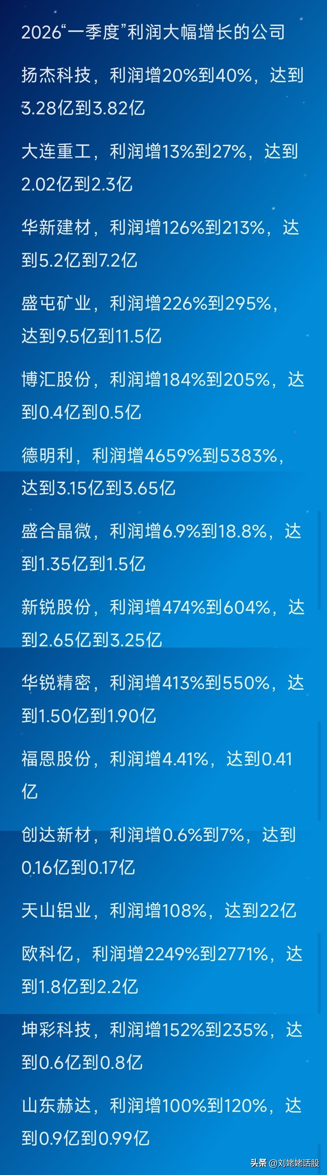“2026年一季报”数据出炉公司汇总。 2026“一季度”利润大幅增长的公司多达14家。利润下滑公司6家。 提前公告的2026年一季报的公司的具体明细详见下图…… 关注“刘姥姥”,精彩分享真不少(麻烦亲们:点赞,收藏,分享)。 特别提醒:本文涉及内容及个股,仅供交流与参考,不是荐股,不得以此作为买卖依据,盈亏自负。2026一季报 一季报绩优股 一季度公司业绩 2026财报季 业绩预增公司