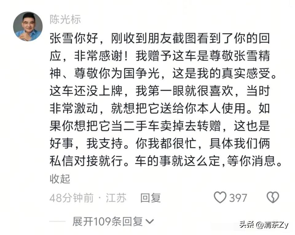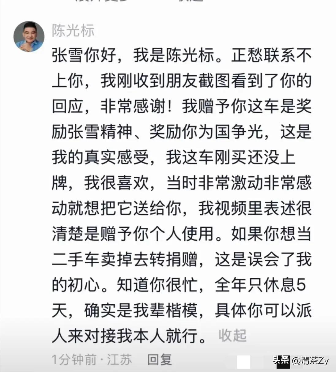 张雪的回复等于把老陈架在火上烤了! 张雪夺冠后,陈光标发视频说,为了表彰张雪为国争冠的事迹,他决定将公司新买的最新款劳斯莱斯车送给张雪接待客户用! 张雪很快回应了标哥,他说接受劳斯莱斯的赠与,说会找一个收二手车的,8折把这辆车给卖掉,款项捐给嫣然天使! 看到张雪的回复后,标哥也很快回应了张雪!他说:这辆车是想奖励你为国争光!视频里已经说得很清楚赠与你个人使用,如果你想卖掉,那你就误会我的意思了! 发出信息后没多久标哥又把信息删掉了,重发了一条内容大概意思是:赠车主要是尊敬张雪精神,车还还没有上牌,就是想让你本人使用!如果你真的想把它当作二手车卖掉也支持! 并说等待张雪和他私信对接!老陈可能也没想到张雪会这么直白!既然这么说了就抓紧时间把车给人家送过去吧!