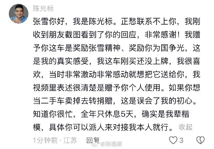 【陈光标说豪车是赠予张雪个人使用】陈光标说张雪想卖车误会了自己的初心 4月2日,就“张雪想卖陈光标赠送豪车给嫣然捐款”,陈光标在评论区给张雪留言:“张雪你好,我是陈光标。正愁联系不上你,我刚收到朋友截图看到了你的回应,非常感谢!我赠予你这车是奖励张雪精神、奖励你为国争光,这是我的真实感受,我这车刚买还没上牌,我很喜欢,当时非常激动非常感动就想把它送给你,我视频里表述很清楚是赠予你个人使用。如果你想当二手车卖掉去转捐赠,这是误会了我的初心。知道你很忙,全年只休息5天,确实是我辈楷模,具体你可以派人来对接我本人就行。”