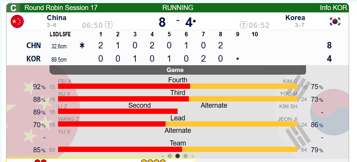 冰壶 【中国-韩国】第八局最后阶段清理占位unlucky,但还是通过double兑现了后手2,也很好 ,中国8-4韩国