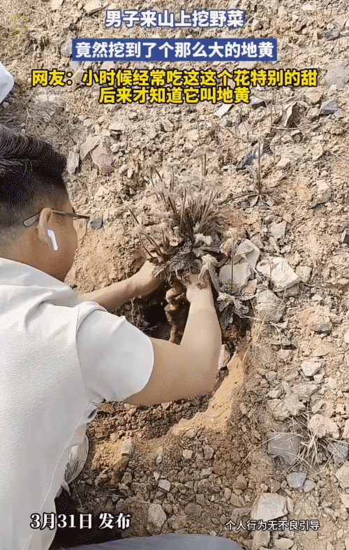 “运气太好了!”男子上山去挖野菜。没想到,他一锄头下去挖出一株地黄。更让他没想到的是,挖出来后,这株地黄根茎很大。 原来,这天男子看天气不错,他扛着锄头,拿了袋子,去山上挖点野菜。而他到山上后,本想找点常见的野菜,弄回去吃。 可他在经过一片山坡时,他看到一株有点像地黄的植物,但是他也不确定。于是男子拿出手机查了查,没想到他看到这株植物,还真是地黄,男子便开始用锄头挖。 他小心心翼翼地挖开土,直到露出这株地黄根须,他一开始以为这株地黄不会太大。 但是他挖开后,也是惊讶了,这株地黄要比他以前看到地黄要大得多。他是越挖越开心,最后他把这株地黄完完整整地挖了出来。 对此有网友说: 我们叫“喇叭花”,小时候经常吸吮它的花尾,特别地甜,后来才知道他叫地黄。 也有网友说: 挖出来也不能直接吃,还需要传统技术炮制才能发挥药性,浪费了。 还有网友说: 小的时候漫山遍野的都是,但是那时不知道它是地黄,只知道摘上边类似小喇叭一样的花朵,用嘴巴咂一下甜西西的! 原来小时候见过地黄,那时候看到这种植物,就觉得它开的花好看,会把花摘了,而且到处都是。但现在回老家,就没看见过。 说起这地黄,很多人可能听过“六味地黄丸”,但未必见过它长在山里新鲜的模样。 地黄其实是一种很常见的植物,喜欢长在山坡、路旁,叶片毛茸茸的,开着紫红色的小花,不怎么起眼。而它的价值全在土下面的根茎上,刚挖出来的新鲜地黄叫“鲜地黄”。 在中医理论中,地黄分为鲜地黄、生地黄和熟地黄三种,功效各有侧重。鲜地黄性寒,主要清热生津;生地黄擅长凉血止血;而经过九蒸九晒炮制后的熟地黄,则成了滋阴补血的要药,像是六味地黄丸这类经典名方里,地黄这类药材就是“主角”。 以往我们见到野生的地黄,大多比较细瘦,能长到拇指粗细已属难得。但像这位男子挖到的这株,块根粗壮、根系完整,可见生长年份不短,也确实证明了这片山坡的土质松软肥沃,给了它充足的生长空间。 最后,对于这位男子而言,这份意外的收获更像是一种乐趣。在亲近自然的过程中,既能感受劳作的快乐,同时又能收获大自然的馈赠,这种简单的满足感,或许比这株地黄本身的价值更加珍贵。 (来源: 重庆城市TV关注)