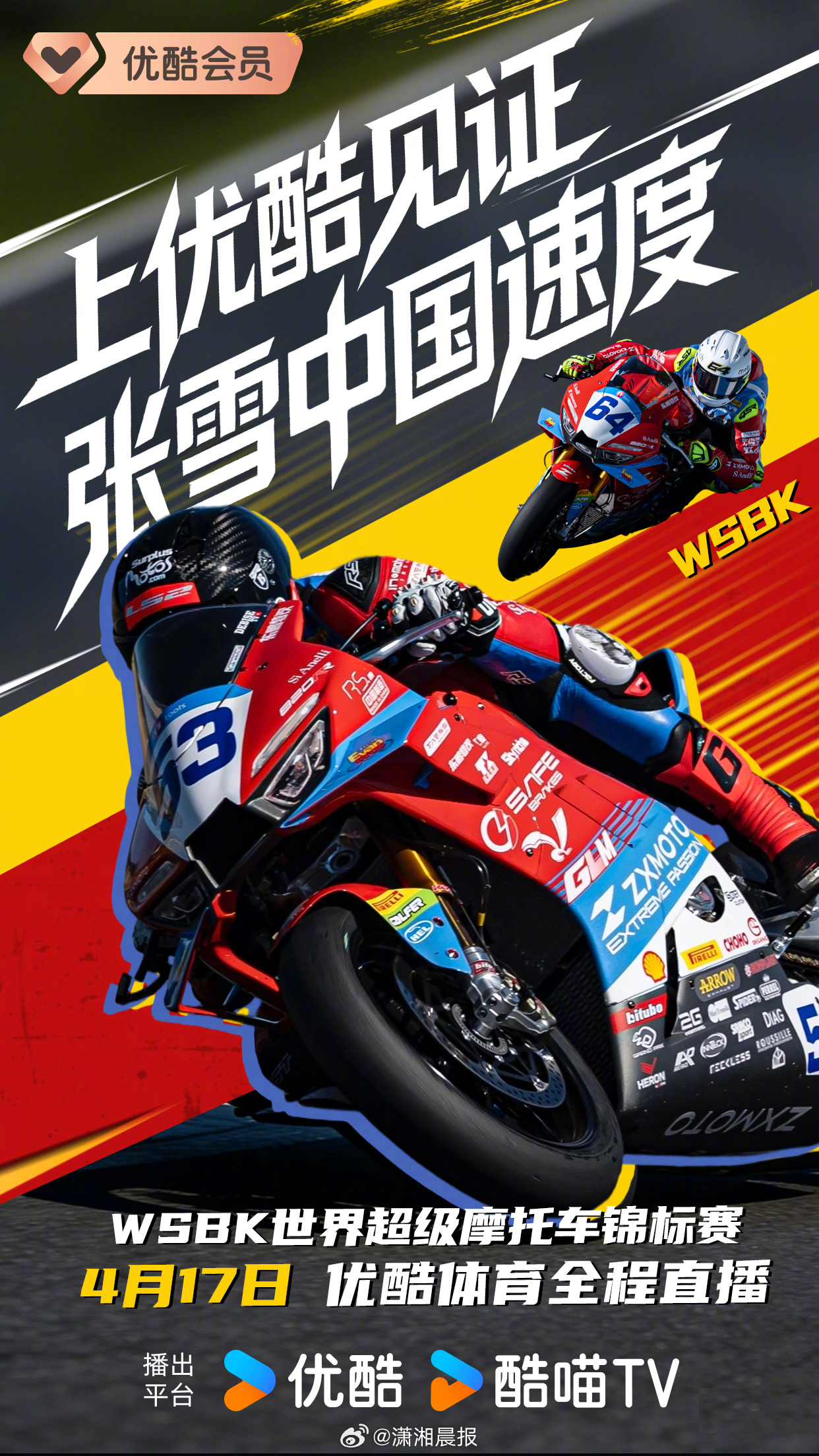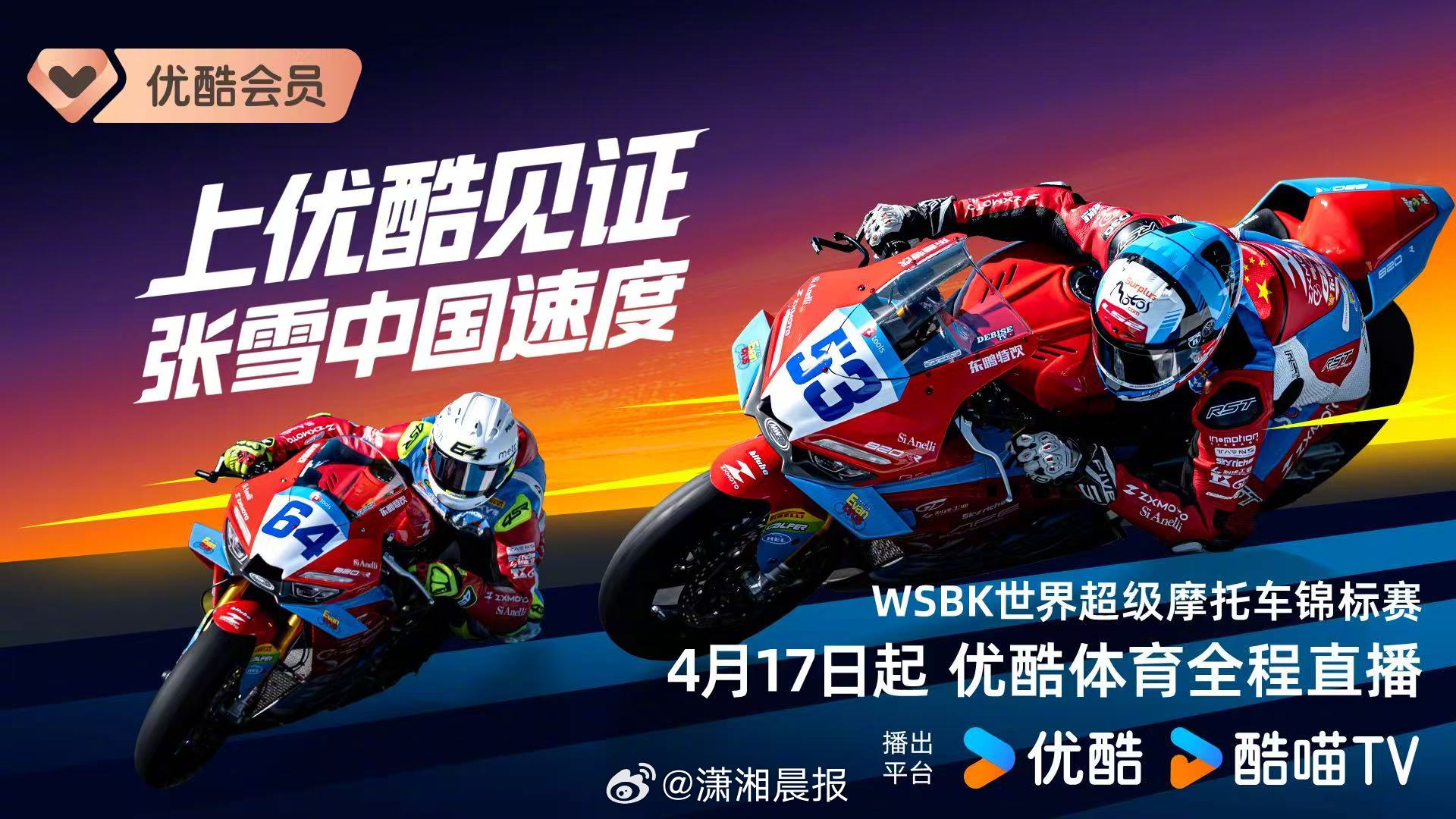 #优酷拿下张雪赛事播出权# 4月1日,优酷体育宣布获得世界超级摩托车锦标赛(以下简称WSBK)、世界摩托车越野锦标赛(以下简称MXGP)两大世界级摩托车赛事版权。4月起,中国观众即可在优酷观看两大赛事后续所有站点比赛直播。