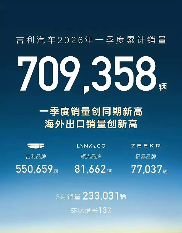 截止2026年3月吉利汽车2026年度官方销量目标及完成进度: