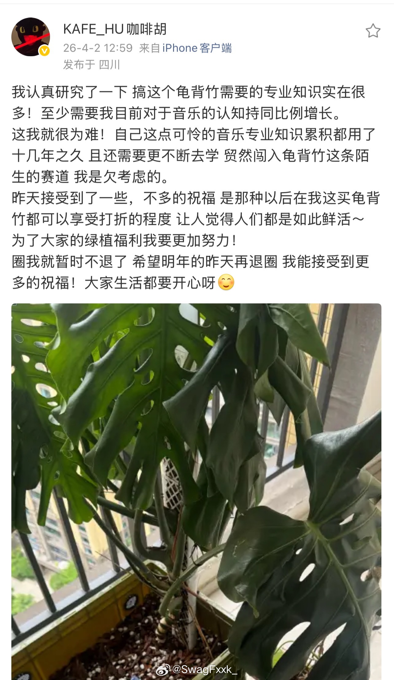之前放话要退圈研究龟背竹的Kafe.Hu表示不退圈了:
