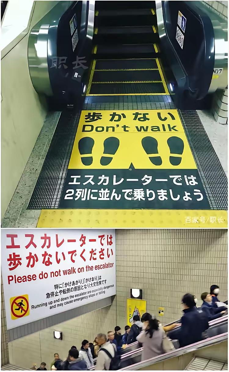 一篇文章说,发现日本人乘电梯,都整整齐齐站在左边(图一), 据说日本人绝不会站在右边,因为右边是为了那些家有急事的人走的, 这篇文章赞美日本人素质高,这场面在中国绝不会出现,我们距离文明还有很大距离, 然而真实情况是,日本早已出台相关规定,严禁站在电梯一边,因为这样会破坏电梯平衡,导致电梯受损,相关宣传语在日本到处都是(图二和图三), 但日本民众根本不理会,这不是素质的问题,而是愚昧、智商和民族性的问题, 在日本,如果你和别人不一样,会被人歧视的。