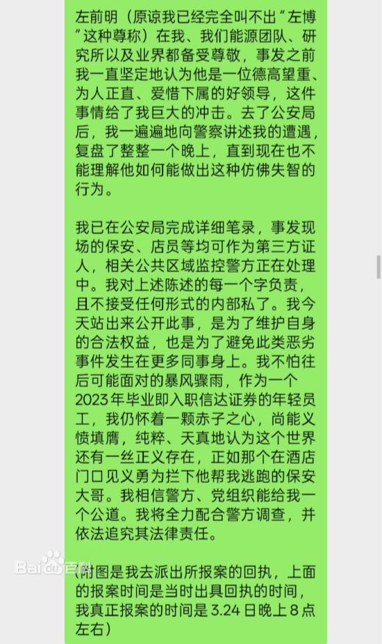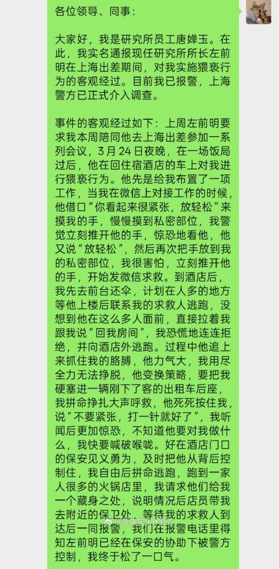 唐婵玉美若天仙让左前明精虫上脑要霸王硬上弓,唐婵玉人间清醒。如果拿50万封口费将万劫不复,他这样的吝啬鬼舍命不舍钱,他能把你按敲诈勒索罪送进去,让求生不得求死不能。 他应该是白嫖惯了,他所里还有哪个女性跟他出过差、参加过酒局,有没有被潜了。他对法律一点敬畏之心没有,在酒店里要强拉进入房间,如果进了房间就是待宰羔羊。一计不成又准备给塞进出租车,这就已经恼羞成怒,如果得逞应该有性命之忧。唐婵玉也是拼死一搏,从酒店往火锅店逃命时,高跟鞋跟都跑折了。 唐婵玉不愧名校高材生,还算沉着冷静,事发后,立刻报警→实名发公司群→晒报警回执→拒绝任何私了。证据链完整:监控、保安、店员、笔录、录音(全留)。 唐婵玉本科:对外经济贸易大学·金融学(顶尖财经211,金融圈认可度极高) 。 硕士:香港科技大学·社会科学(全球Top50,社科/法律意识强)。 2023年4月:独立校招入职信达证券研究所(无内推、无背景)。 唐婵玉为什么她敢硬刚到底。1.学历硬、能力强:去哪都能找到工作,不怕被开除。 2.无资源牵绊:没靠家里、没欠人情、没把柄在领导手里。 3.法律/社会认知高:懂权力结构、懂性骚扰、 懂报警比忍有用。 唐婵玉事件正是张雪峰)普通家庭女孩别学金融的正面典型。