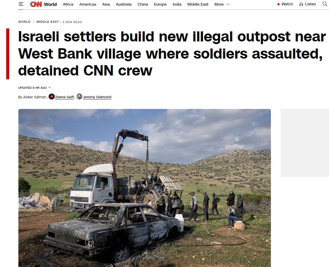 不到5天,又开始了......... 据美媒CNN:以色列定居者对被占领的约旦河西岸塔亚西尔的巴勒斯坦居民发动了最新一次袭击。四名巴勒斯坦人受伤,车辆和农舍被纵火烧毁。一个IDF的非法前哨站重新建立。 五天前,定居者袭击了塔亚西尔村,殴打多名村民,并在该村庄建立了非法据点。美国记者目睹了一切,随后却被拘留。此后,以色列军方暂停了相关部队的行动。 🦑粉注意:这是CNN的现场报道,你们不会又说是假新闻吧!