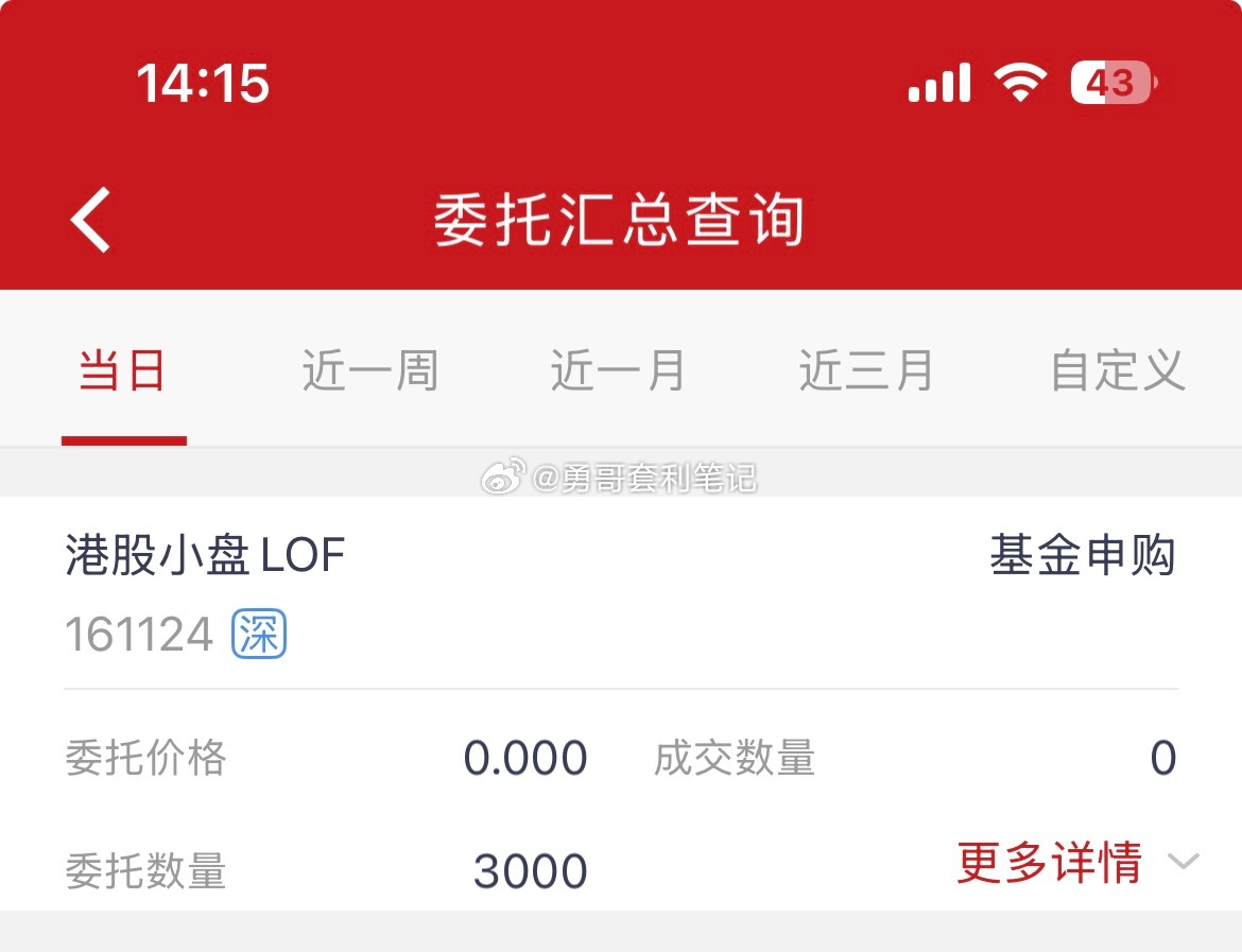基金套利 香港小盘161124溢价率7%,限额1000*6,无底仓不建议参与。我有两千底仓,申购了三千,玩一玩试试水😏仅供参考,抄作业有风险,套利需谨慎,所有申购盘中跳水,溢价率抹平或大幅缩小将撤单!实盘贴图仅作为个人记录之用,不构成任何投资建议及操作指引!盈亏自负,切勿盲目跟风!基金