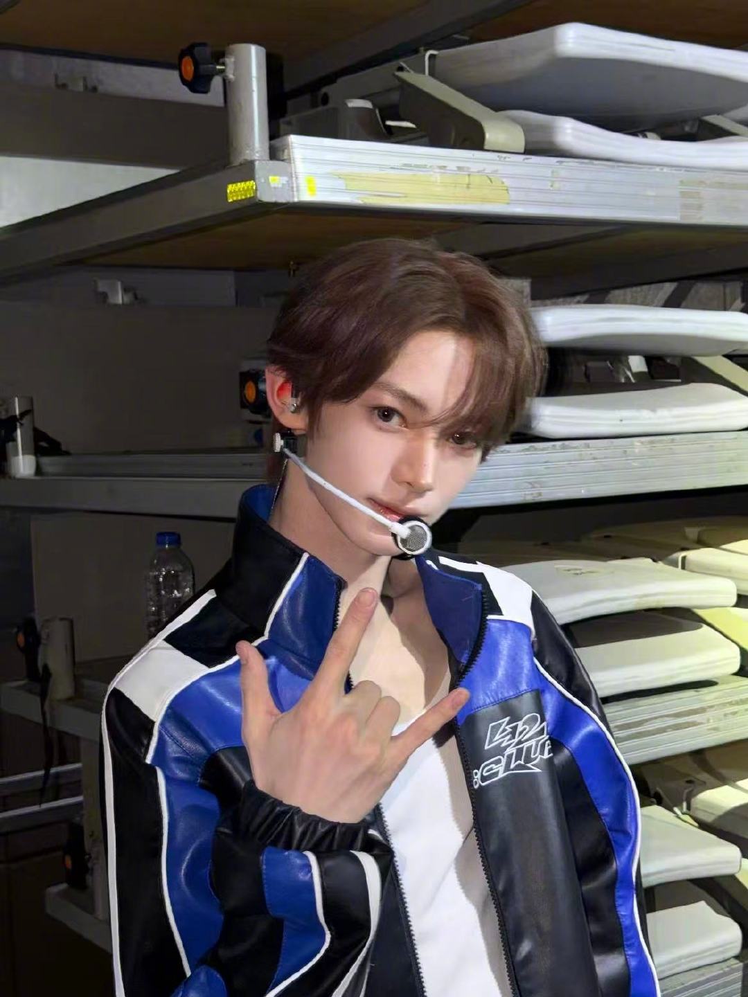 韩振露额头快去看韩振最新动态!蓝黑色皮衣搭配露额头造型,清爽又利落,五官精致立