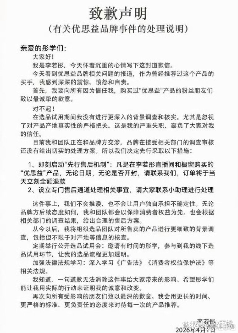 李若彤,道歉了!优思益伪装洋品牌被揭露后,曾直播带货的李若彤发文道歉了!