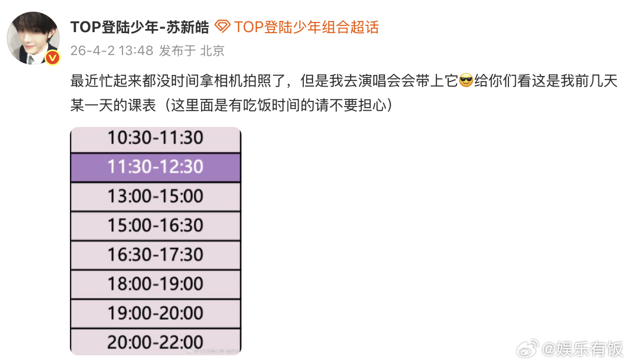 低精力人看完苏新皓课表都力竭了 看了这满满当当的日程表,低精力人直接原地力竭!从早排到晚的行程,小苏这自律程度真的太拼了~