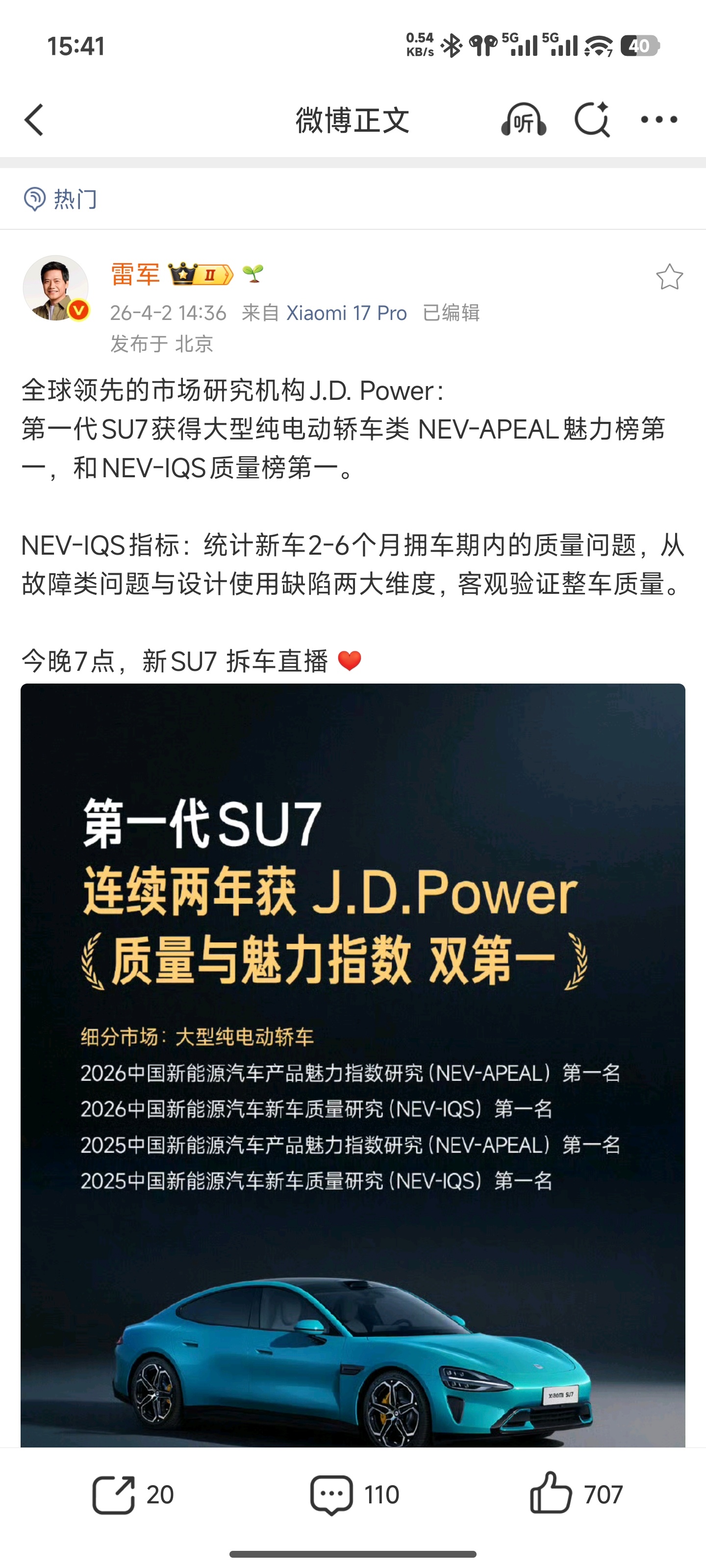 雷军回应JDpower小米双车双榜第一