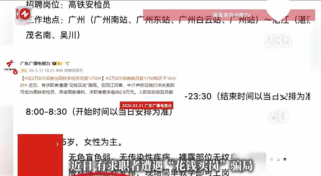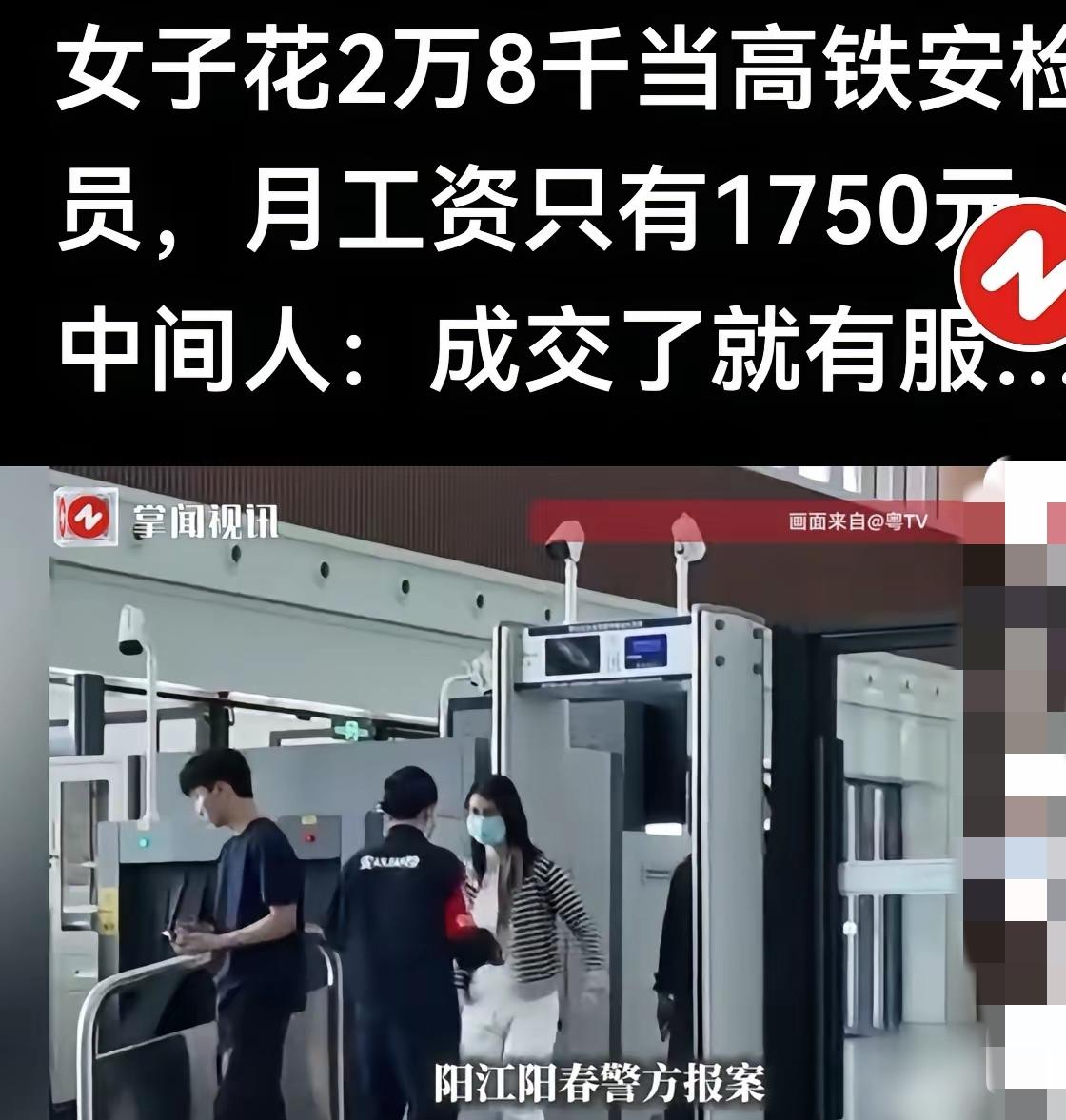 真是太扎心了!河南一女子,竟花28000元买高铁安检员内部名额,结果踩坑踩到底,后悔都来不及。 中介一顿忽悠,说这是体面稳定的好工作,福利高、待遇好,花点钱几个月就能回本。 女子一听是高铁正式岗,看着制服光鲜又体面,咬咬牙交了两万八。 可真上岗直接傻了眼,每天站足足16个小时,早六晚十,吃饭只有40分钟,累到腿脚发麻。 好不容易等到发工资,到手只有1750元,连基本生活都不够。 她仔细一算,不吃不喝要16个月才能回本,越干越亏。 去找中介退钱,对方直接耍赖,成交就不退,报警还属于民事纠纷,不立案。 说白了,就是黑中介抓住普通人想找稳定工作的心理,用虚假噱头收割血汗钱。 法律早就规定,找工作先收钱的全是违规,岗前收费、内部名额、好处费,全都是套路。 大家找工作一定要擦亮眼睛,别轻信所谓内定、好岗位,真出事维权太难了。 这种中介套路实在太坑人,你们身边有人上过当吗?