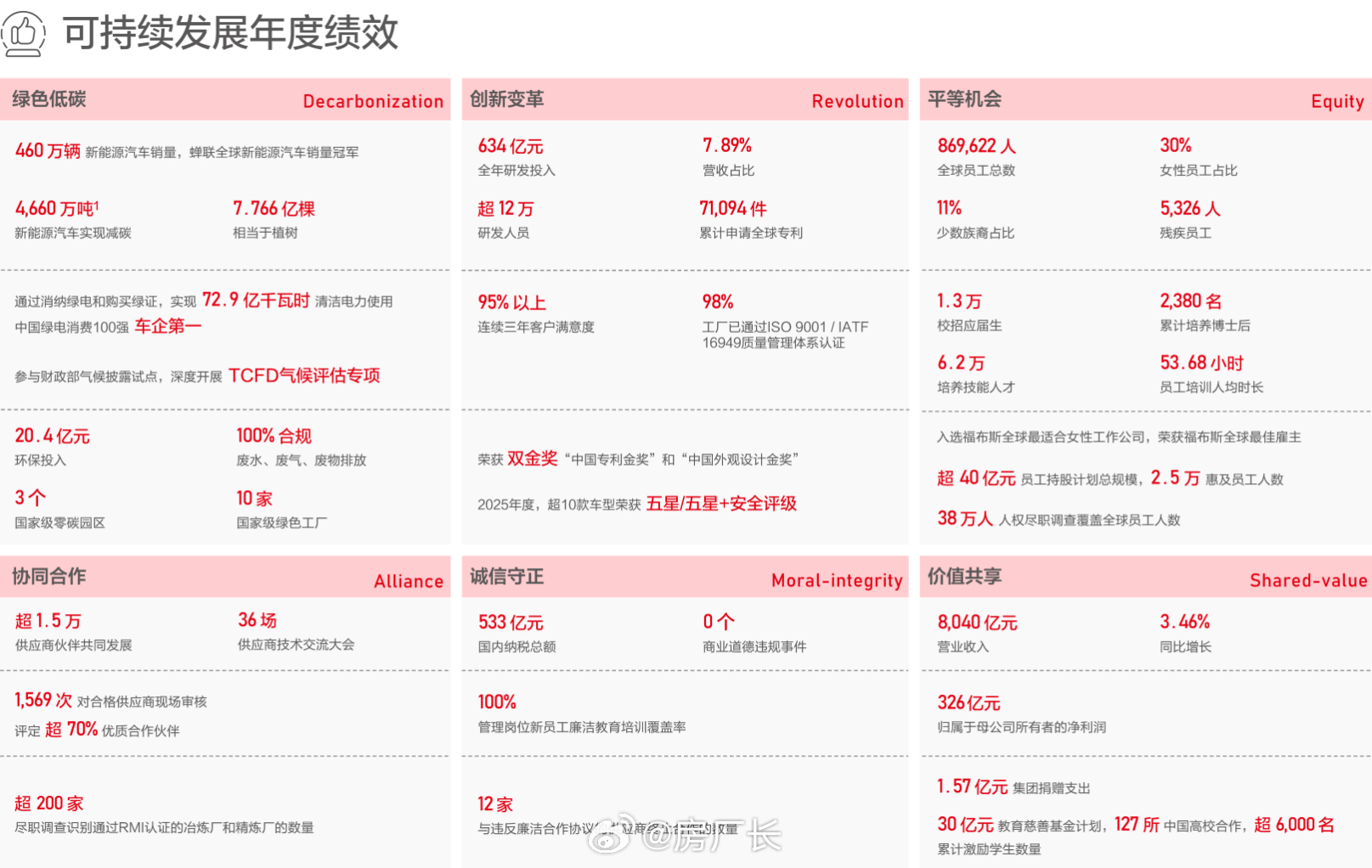 比亚迪发了一份可持续发展报告,有组数据很亮眼:2025年研发砸了634亿,营收占比近8%。手里还攥着超12万人搞研发,全球专利超7万件,都是真金白银堆出来的。这么砸钱也确实出活,今年的第二代刀片电池和闪充技术直接刷新充电天花板,解决了大家最头疼的“充电慢、低温难”两大痛点;近三年还有11款车型拿下NCAP五星/五星+评级,不管国内还是海外,安全都拉满。ESG评级也位列中国企业第一梯队,储能全球第一,去年减碳4660万吨,相当于种了7.7亿棵树。比亚迪坚定实现绿色梦想,默默把社会责任落到实处,希望这样的中国车企越来越多。智驾数码团