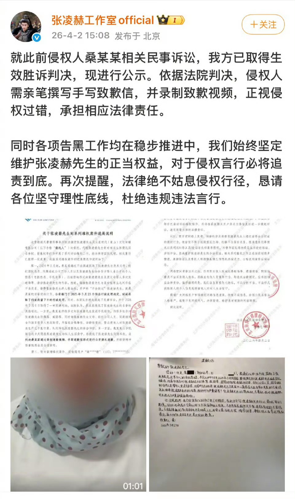 张凌赫工作室更新告黑进度,潶粉手写道歉信道歉! 张杰回应张凌赫送花篮
