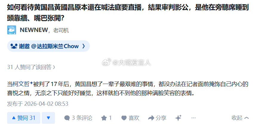 柯文哲在法庭上受审时,前小绿蛙黄国昌,在靠着墙壁睡觉图3这个解释,只有柯的支持者小草们,才不会笑热点观点 ,柯文哲一审被判处17年 ,柯文哲所涉京华城案政治献金案一审宣判