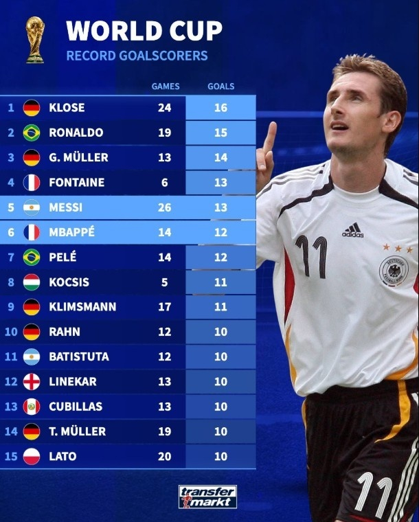 1 克洛泽(德国)24战16球2 罗纳尔多(巴西)19战15球3 盖德·穆勒(德国)13战14球4 方丹(法国)6战13球5 梅西(阿根廷)26战13球6 姆巴佩(法国)14战12球7 贝利(巴西)14战12球8 柯奇士(匈牙利)5战11球9 克林斯曼(德国)17战11球10 拉恩(德国)12战10球11 巴蒂斯图塔(阿根廷)12战10球12 莱因克尔(英格兰)13战10球13 库比利亚斯(秘鲁)13战10球14 托马斯·穆勒(德国)19战10球15 拉托(波兰)20战10球
