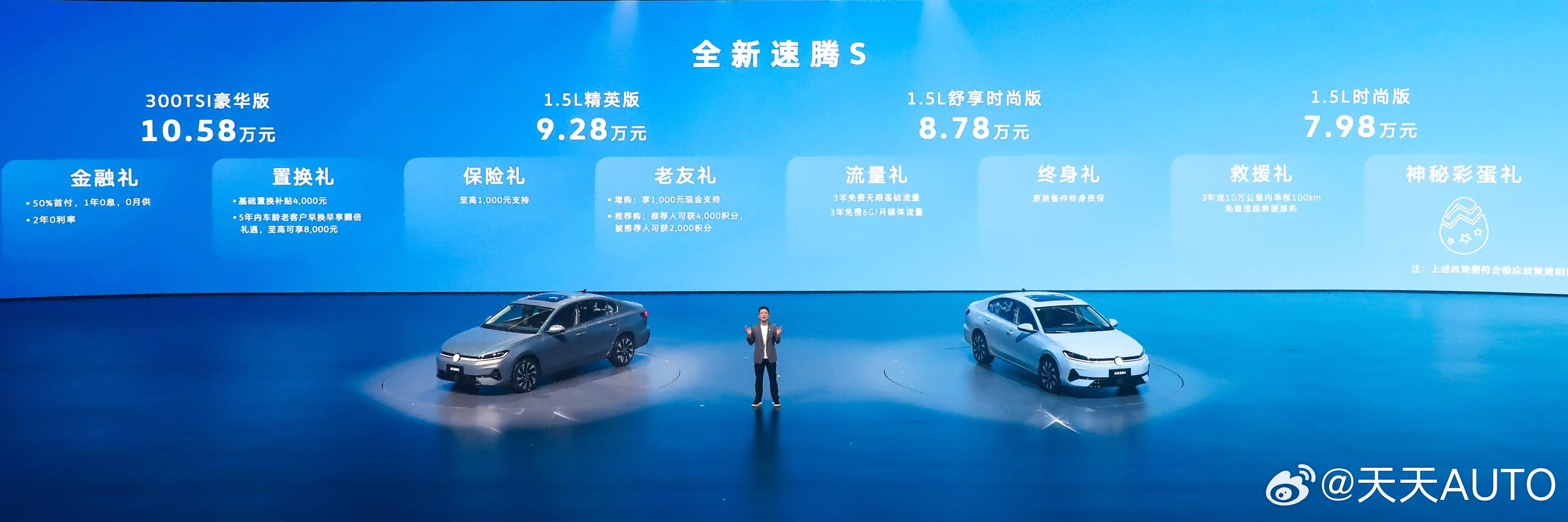 四大家族焕新 五车重磅登场根植35年造车底蕴,聚焦广大用户多元化出行需求,一汽-大众全明星新品重磅登场。速腾、迈腾、探岳、双揽四大明星家族联袂升级,五款新车震撼登场,加速推进“油电混共进全智”战略布局,为广大客户带来更丰富、更值得信赖的出行选择。入华20年来,速腾历经四代演进、获得450万信赖,是唯一一款畅销20年、至今仍能月销2万+的现象级车型。此次春季新品发布会,速腾家族迎来新成员——全新速腾S,7.98万元起售,以“德、智、体、美”全能实力,为广大客户带来全新体验。