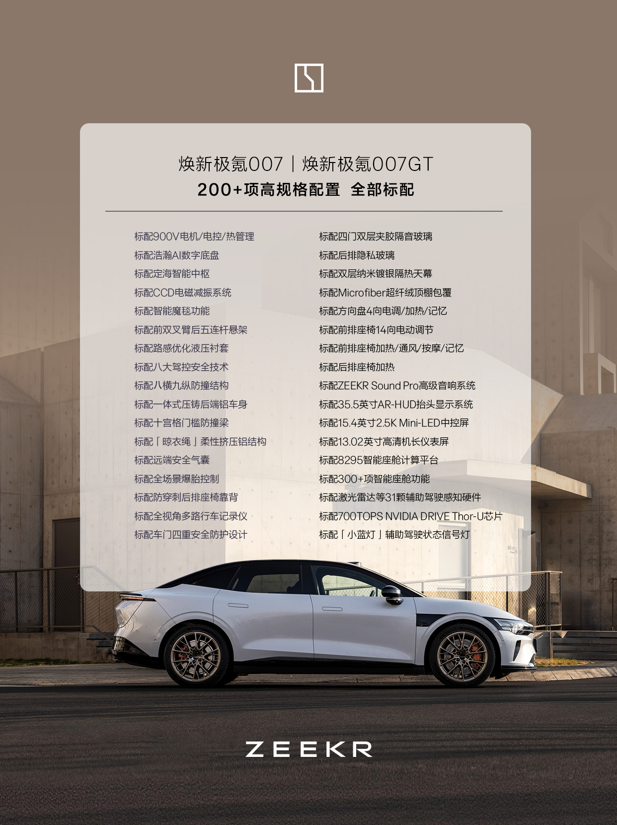 焕新极氪007GT 焕新极氪007和007 GT开启预售,4月10号开大定,目前是公布了主要的变化,新增FR line的套件很帅,三电性能方面:新007零百加速2.73秒、续航905km;新007GT零百2.85秒、续航最高880km。全面2秒俱乐部,两车还升级900V高压架构与700TOPS的Thor-U芯片。极氪是在新能源里少有的能给人上情绪价值的