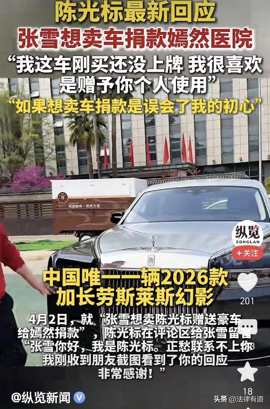 1300万劳斯莱斯送不送?陈光标赠车张雪事件法律全解读。 4月1日,昔日的“中国首善”陈光标在社交平台发布视频,宣布要把公司刚刚购买的一辆“中国唯一一辆2026款加长劳斯莱斯幻影”——市场价1300万元,“赠予”张雪机车创始人张雪。整件事从赠车到回应再到反转,短短两天之内剧情几度起落,把无数吃瓜群众看得一愣一愣的。 2026年3月28日至29日,世界超级摩托车锦标赛葡萄牙站,张雪创立的“张雪机车”车队驾驶自主研发的820RR-RS赛车,在SSP组别连夺两回合正赛冠军。这是中国品牌摩托车首次在这一国际顶级赛事中登顶。 陈光标随即在社交平台发布视频,宣布要将其公司刚购入的中国唯一一辆2026款加长劳斯莱斯幻影赠予张雪,作为接待用车。 然而张雪在昨天社交平台发文,表示接受赠予,但是要找个车上八折卖了,把钱还给嫣然天使基金,自己公司还是用面包车接待。 事情到这里,原本还算朝着皆大欢喜的方向发展:陈光标赠车,张雪收车,所得款项捐给嫣然天使基金做公益,谁都不亏。 但陈光标接下来的反应,才真正把这出戏推向高潮。 据报道,陈光标最初在张雪评论区留言表示:………这车刚买还没上牌,……当时非常激动非常感动就想把它送给张雪,……是赠予个人使用。如果想当二手车卖掉去转捐赠,是误会其初心。言下之意:这车是给你个人用的,不是让你卖了捐款的。 然而令人玩味的是,这条留言在发出几分钟后便被陈光标删除。随后他重新留言,措辞大幅调整,表示:即便张雪想卖了捐赠,也支持…… @法律有道 这起事件之所以引发广泛讨论,除了双方当事人的“名流效应”之外,一个关键的法律问题始终悬在公众心头:陈光标公开承诺送车,如果最后反悔不送了,法律上站得住脚吗? 要回答这个问题,需要从《民法典》中关于赠与合同的规定说起。 赠与合同是赠与人将自己的财产无偿给予受赠人,受赠人表示接受赠与的合同。赠与合同属于单务合同。 《民法典》第六百五十七条明确规定,赠与合同自“赠与人与受赠人意思表示一致时”成立。也就是说,只要赠与人作出赠与的意思表示、受赠人表示接受,赠与合同即告成立,不需要以实际交付财产为要件。从这个角度说,陈光标在社交平台公开表示赠车,张雪回应“那我收了”,双方意思表示已经达成一致,赠与合同在法律上已经成立。 但这只是问题的第一层。 赠与合同最大的特点在于,《民法典》赋予了赠与人一项特殊的权利——任意撤销权。 《民法典》第六百五十八条第一款规定:“赠与人在赠与财产的权利转移之前可以撤销赠与。”这意味着,即便赠与合同已经成立,只要财产还没有正式交付,赠与人就可以单方面反悔,不需要说明理由,也不需要征得受赠人同意。 法律之所以赋予赠与人任意撤销权,根本原因在于赠与合同的单务性和无偿性。赠与不同于买卖合同,受赠人没有付出任何对价,赠与人反悔通常不会给受赠人造成实质性损失。因此,法律在保护受赠人合理期待的同时,也要兼顾赠与人的意思自由,允许其在财产权利转移之前改变主意。 但这一权利并非绝对。 《民法典》第六百五十八条第二款明确规定了例外情形:“经过公证的赠与合同或者依法不得撤销的具有救灾、扶贫、助残等公益、道德义务性质的赠与合同,不适用前款规定。” 这意味着,如果赠与合同经过了公证,或者具有救灾、扶贫、助残等公益性质的,赠与人就不能随意撤销了。 那么,陈光标赠车的行为属于“公益性质的赠与”吗?这是一个值得深入讨论的问题。 从表面上看,陈光标赠车的目的是“表彰为国争光”,似乎带有一定的社会激励和道德褒奖色彩。但仔细分析,这一赠与行为的直接受益人是张雪个人——车是送给张雪“本人使用”的,并非直接捐赠给公益机构或用于公共事业。严格来说,陈光标赠车的行为更接近于对个人成就的物质奖励,而非法律意义上的“公益性质的赠与”。 所以在车辆正式过户或交付到张雪手中之前,陈光标在法律上依然拥有撤销赠与的权利。这意味着,如果陈光标最终改变主意决定不再赠送,在法律层面上并无阻碍。 还有一个值得探讨的细节:陈光标是通过社交平台公开承诺赠车的。这种“公开承诺”是否会影响其撤销权? 实际上,陈光标赠车的性质更接近于个人对个人的奖励性赠与,而非公益性质的公开募捐承诺。因此,即便是在公开场合作出的承诺,只要不满足法律规定的例外情形,赠与人仍可依法行使任意撤销权。 当然,从道德和公信力角度而言,公开承诺后又反悔,在舆论场上必然要付出相应的代价。 此外,“赠予”还是“赠予使用”,完全不同: 这场赠车的真正玄机可能在“使用权”还是“所有权”上。直接送车属于法律意义上的“赠与”,受赠人获得所有权。如果只是送“使用权”,那财产所有权仍是赠予人。 在千万豪车的华丽包装之下,是一个关于法律的问题,更是关于善意、信任与诚信的社会命题。