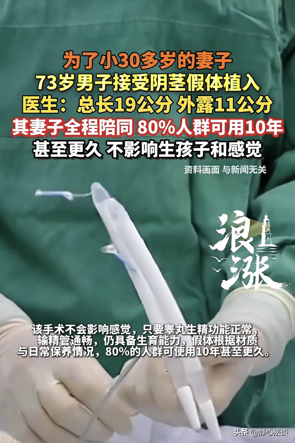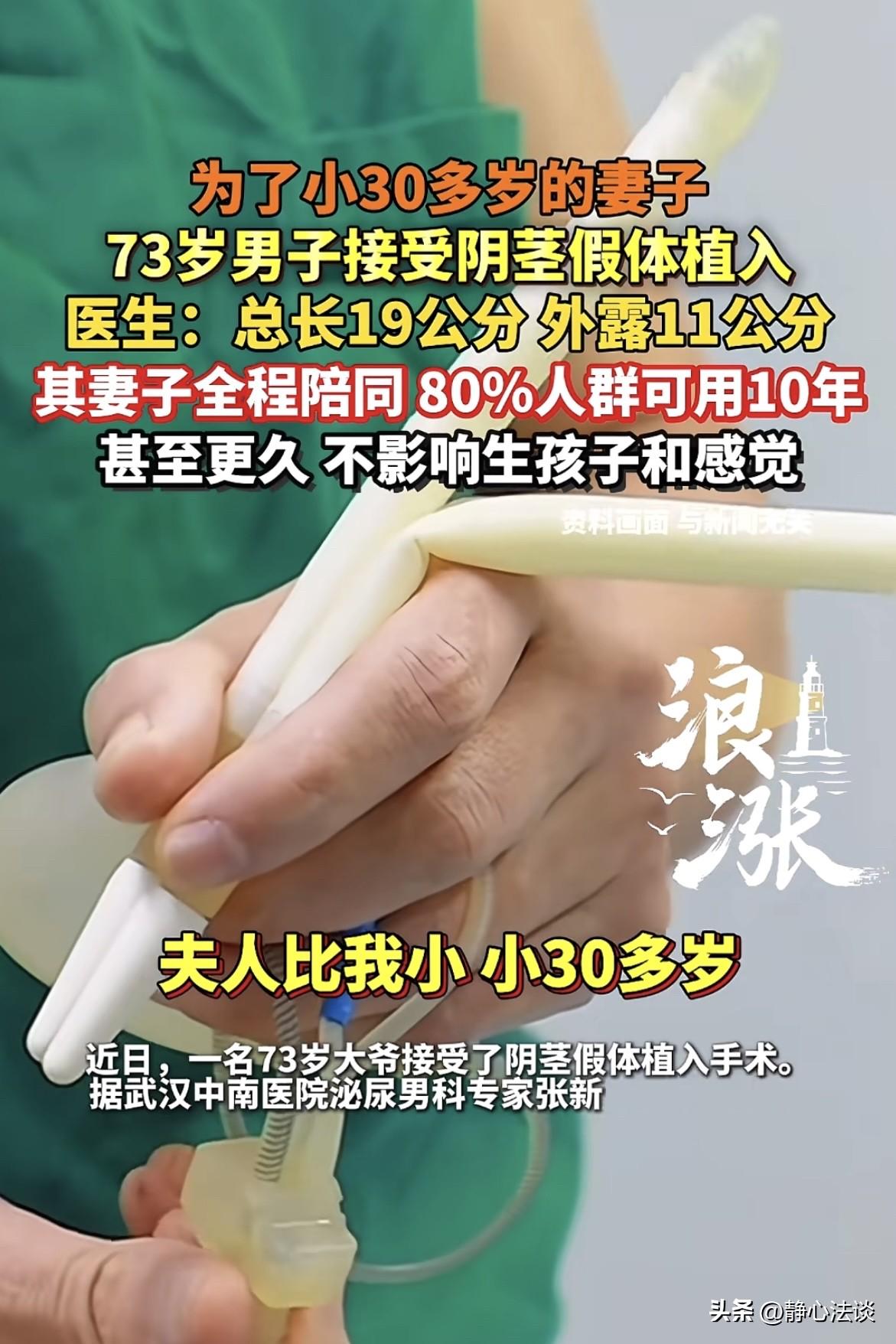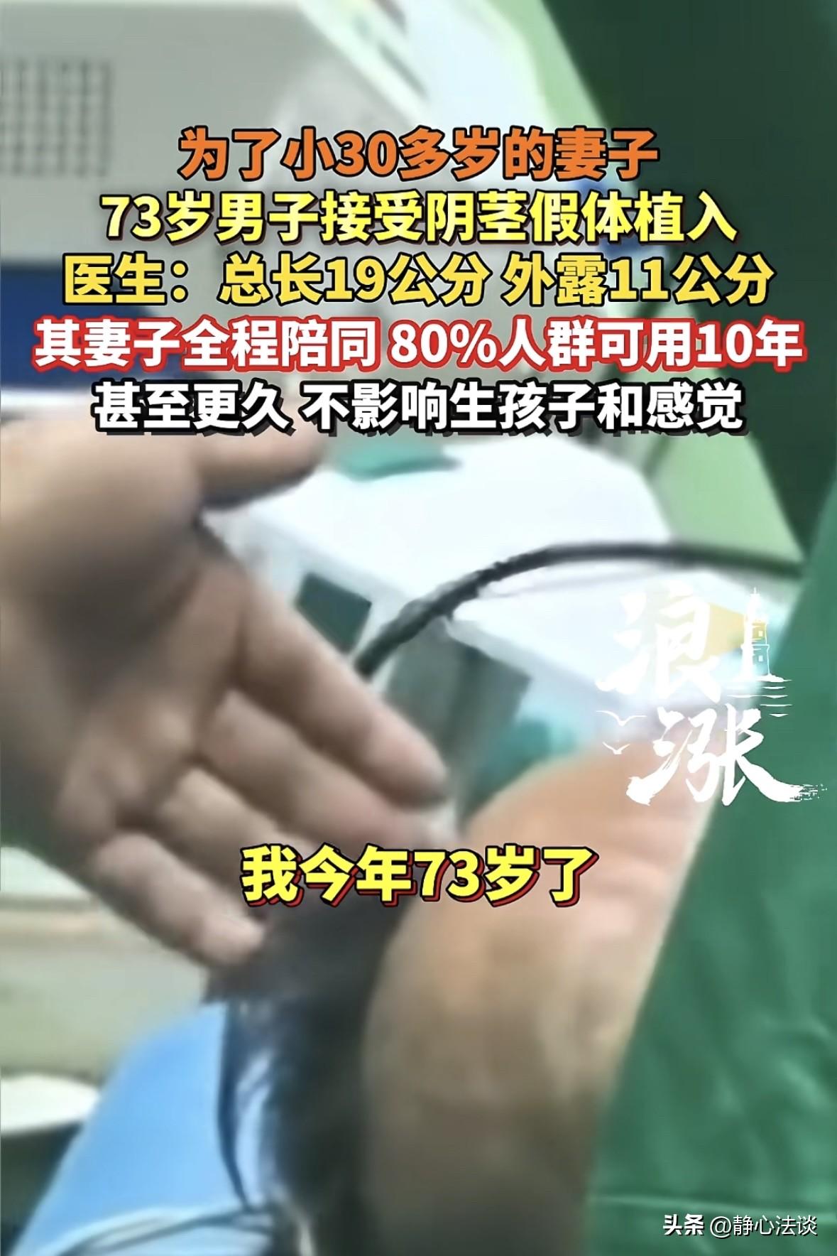 湖北武汉,73岁大爷为了稳固与小30岁妻子的婚姻,选择植入19厘米长的 阴 茎 假 体手术,满足两人正常的生活需求,妻子双手赞同,并全程陪同,医生:不影响生孩子和感觉,用10年一点问题都没有! 73岁大爷和妻子结婚多年,可妻子比他小30多岁,大家都说他一把年纪了还赶时髦。 两人刚在一起的时候,也过了一段时间好日子,直到五六年前,突然就卡壳了。 起初是夜里的沉默,后来是妻子欲言又止的眼神,虽然她什么都不说,但是大爷心里都明白。 他这辈子好面子,年轻时扛沙袋,再累都没喊过一声苦,可现在,他觉得自己比扛着两百斤沙袋还累。 他后来陆陆续续买了很多药,中药西药都试了,可身体却像被抽走了力气,任他怎么折腾都抬不起头。 日子一天天的过,可大爷心里始终有个疙瘩,觉得很对不起妻子。 后来听说现在可以做植入假 体,跟真的一样,他半信半疑的找到某医院,说完情况后,对方告诉他能解决这个问题。 大爷高兴坏了,但是由于自己的年龄原因,他又怕。 怕自己这么大年纪做手术,万一出点差错,把命搭进去,怕手术之后,街坊邻居的闲话能把人淹了。 可转念一想到妻子每次落寞的眼神,他就又不怕了。 哪怕被人说闲话,哪怕要挨一刀,他也得拼一把。 不管怎样,他都不能让妻子在自己这守空房,更不能让别人戳她脊梁骨说她男人没用! 回家大爷就把这事跟妻子说了,妻子了解后,觉得没有危险大可以试一试。 后来在妻子的陪伴下,大爷鼓起勇气走进了手术室。 医生告诉他们,给大爷用的假 体是19公分,外露11公分,可以说跟年轻的时候差不多。 而且80%的人能用十年以上,不影响你们要孩子,也不影响感觉,跟真的一样使。 手术也非常顺利,出了手术室,大爷一眼就看到守在门口的妻子,两个人什么话都没说,都红了眼眶。 大爷恢复的也很快,两人回到家后,有邻居忍不住在背后嘀咕,都七老八十了,还搞这些花里胡哨的,安安稳稳过日子的了。 大爷才不管那个,你爱说说你的,日子是自己的,舒服不舒服,只有自己知道。 这事后来被发到网上,评论区都炸了锅。 有人觉得人家老两口感情好,愿意为对方折腾,总比那些年轻时花天酒地,老了就甩锅的男人强百倍! 只要不伤害别人,自己的身体自己做主,这才叫活出个人样。 还有人调侃,大爷真懵啊,还我可能都躺平了。 《民法典》第1043条:家庭应当树立优良家风,弘扬家庭美德,重视家庭文明建设。夫妻应当互相忠实,互相尊重,互相关爱。家庭成员应当敬老爱幼,互相帮助,维护平等、和睦、文明的婚姻家庭关系。 大爷为维护婚姻稳定选择手术,妻子全程支持陪同,体现了夫妻间的互相尊重、互相关爱, 《民法典》第1002条:自然人享有生命权,自然人的生命安全和生命尊严受法律保护,任何组织或者个人不得侵害他人的生命权。 73岁大爷选择 阴 茎 假 体 植入手术,本质是对自身生命健康权的合理行使。 手术目的是改善生活质量,维护婚姻稳定,且经医院评估符合手术条件,未侵害自身或他人生命安全与尊严。 他人若以年龄大不该折腾,丢人等理由恶意诋毁,可能构成对其生命尊严的侵害。 对此,你怎们看这件事! @静心法谈 ,学法辨是非,慬法不吃亏。