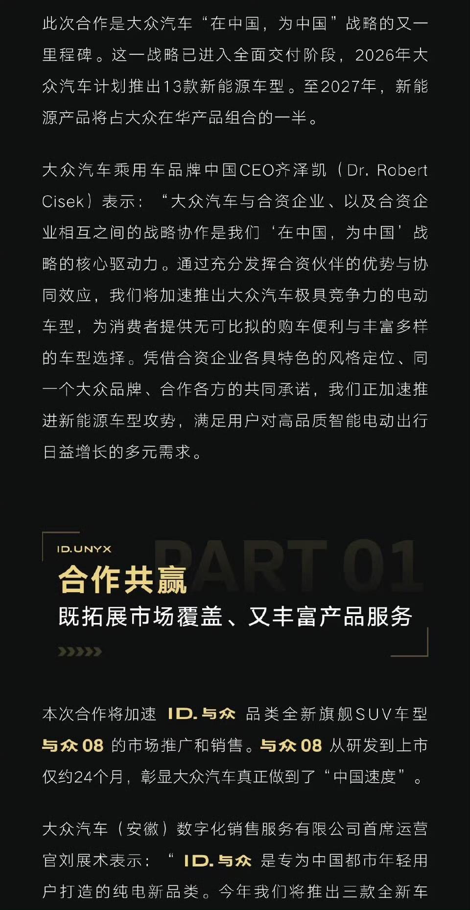 大众汽车(中国)、大众安徽、一汽-大众正式签署经销商网络战略合作备忘录。 店中店模式下,一汽-大众授权经销商将设专属区域,销售大众安徽ID.与众纯电车型,与众08为首款合作车型。网络优先覆盖30个空白城市,快速下沉补全触点。 首批与众08将于2026年4月上市落地,后续ID. 与众轿车同步推进。长期将支撑大众安徽3款新车、一汽-大众 ID.AURA 系列4款新能源车渠道落地。 类似多品牌同网运营,高效盘活渠道资源,大众安徽降本提效,一汽-大众丰富新能源矩阵,集团打破壁垒。【来自懂车帝车友圈】